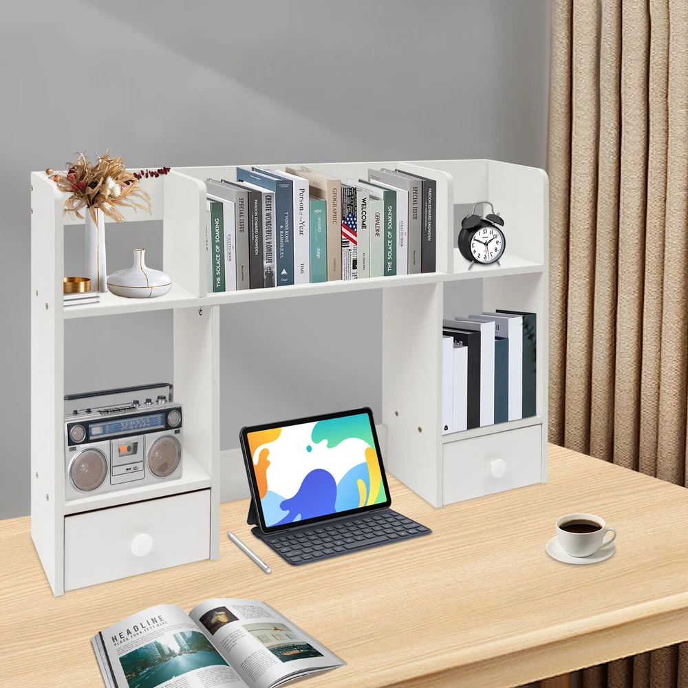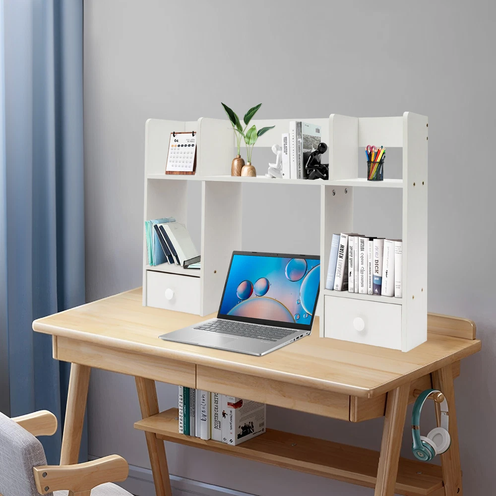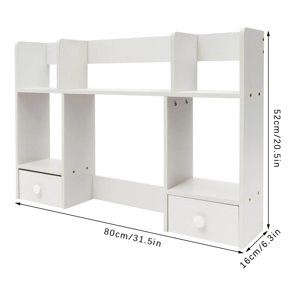 Specification Material: MDF, Particle Board Color: White Process: Polishing, Sanding Style: Modern Assembly Required: Yes Mounting Type: Tabletop Shape: Rectangular Height of Computer Display Area: 32cm/12.6in Partition Thickness: 16mm/0.63in Total Load Capacity: About 7.5kg/16.53lbs Product Size: 80*16*52cm/31.5*6.3*20.5in Package Size: 80*20*9cm/31.5*7.87*3.54in Gross Weight: 5kg/11.02lbs Net Weight: 4.5kg/9.92lbs Package Included 1* Desktop Storage Rack 1* Chinese Assembly Diagram Other Accessories for Assembly Description Desktop storage space is often limited, so if you're still struggling with this, please take a look at our desktop storage rack, which is an efficient organizing solution designed for desktops. It combines a rational space layout with a simple design style, aiming to provide your desktop with an organizing tool that is both beautiful and practical. Whether it's a desk, desk, or vanity, it's easy to handle. Key Features Made to Last: Made of high-quality MDF and particle board with polishing and sanding processes, it is impact-resistant and has a sturdy structure and smooth surface that is not easy to deform, ensuring long-term aesthetics and practicality. Storage Assistant: The product adopts reasonable double-tier three compartments and two drawers structure design, which can effectively help you categorize and store books, files, computers, cell phones, ornaments, green plants, etc., providing you with a clean and tidy desktop environment. Carefully Designed: This product is designed with a computer display area of 12.6 inches in height, making it easy for you to place your computer on the desk for your office working needs. Strong Load-bearing Capacity: The thickened partition (16mm), stable rectangular structure, and strong screw fixation give the product a strong load-bearing capacity (about 16.53 lbs), which can easily carry the weight of books, stationery, and so on. Thoughtful Design: The product is designed with three sides of raised enclosures, which can effectively prevent your items from falling. Easy Assembly: A simple structure and complete accessories allow you to finish the installation quickly and use it in a short time. Effortless Cleaning: It has a smooth surface and an open structure, so you only need to wipe the dust with a towel (not included). Ideal Gift: With good performance and a modern appearance, it can be used as an ideal housewarming gift for parents, friends, and lovers so that they can also enjoy a more convenient life. Good Customer Service: We aim to provide quality products and services. If you have problems, please feel free to contact us. We will reply and solve the problem for you as soon as possible. Details Drawer Handles: They provide convenience for you to pull out the drawer and get your items. Rounded Corners: The delicate edge treatment reduces bumping injuries and ensures the safety of your use. Application You can put this product in your kitchen, bathroom, workshop, or office to organize stationery, desk files, mail, tools, and more. Specification Material: MDF, Particle Board Color: White Process: Polishing, Sanding Style: Modern Assembly Required: Yes Mounting Type: Tabletop Shape: Rectangular Height of Computer Display Area: 32cm/12.6in Partition Thickness: 16mm/0.63in Total Load Capacity: About 7.5kg/16.53lbs Product Size: 80*16*52cm/31.5*6.3*20.5in Package Size: 80*20*9cm/31.5*7.87*3.54in Gross Weight: 5kg/11.02lbs Net Weight: 4.5kg/9.92lbs Package Included 1* Desktop Storage Rack 1* Chinese Assembly Diagram Other Accessories for Assembly Notes Please note that this product does not include items such as books and documents. Please allow the slight color difference caused by the shooting light and 1-3cm error due to manual measurement, and make sure you do not mind before ordering. On Nov 5, 2024 at 22:12:56 PST, seller added the following information: