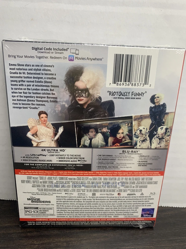 Experience the ultimate adventure with Disney's CRUELLA 4K UHD+BLURAY+DIGITAL TARGET EXCLUSIVE ART EDITION. This limited edition movie comes in a Blu-ray case and features a PG-13 rating. The movie is directed by Craig Gillespie and stars Emma Stone as the lead actor. The edition includes additional scenes and a behind-the-scenes featurette. The movie is a live-action movie and falls under the Adventure genre. The release year is 2021 and the producer is Andrew Gunn. The movie is a must-watch for all Disney fans and is a perfect addition to your collection.