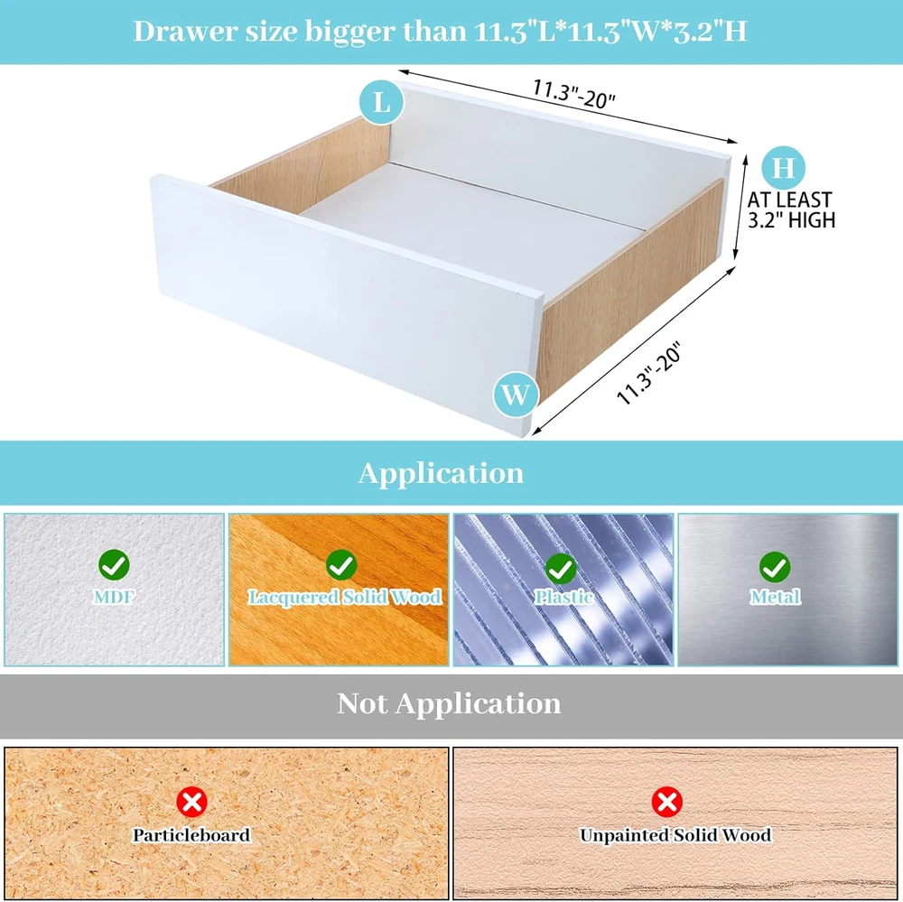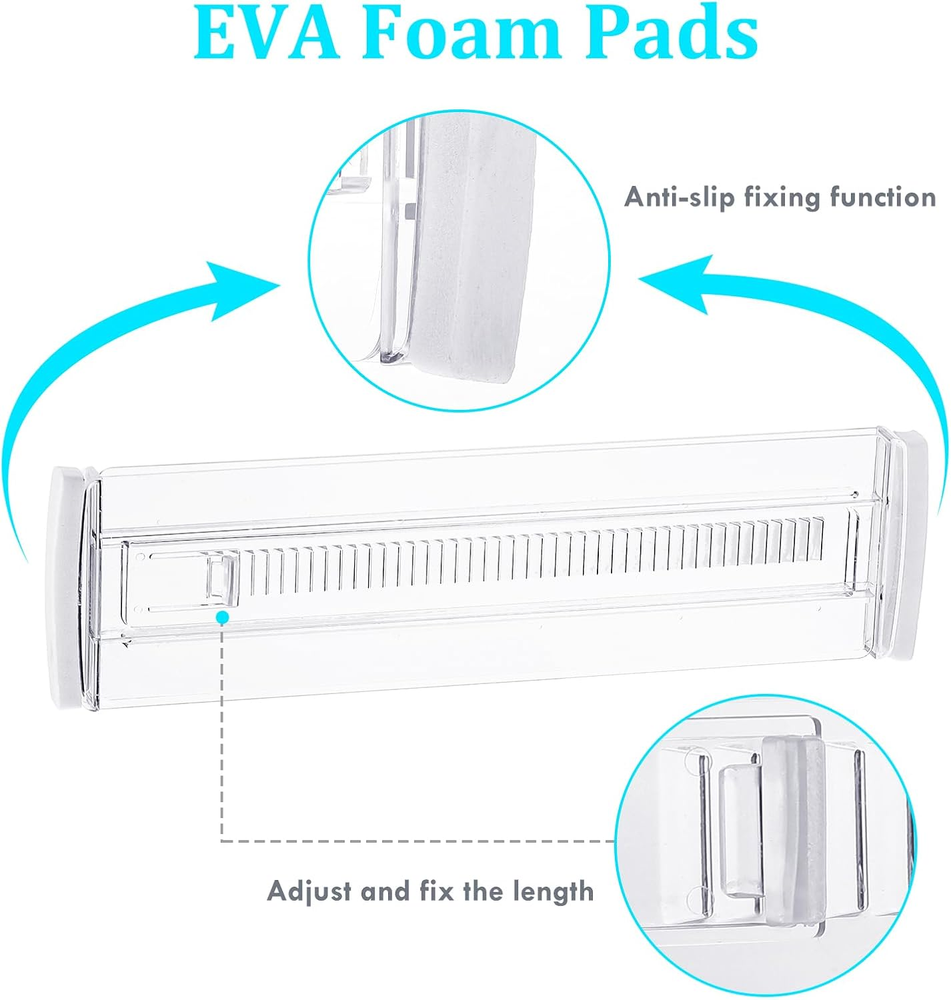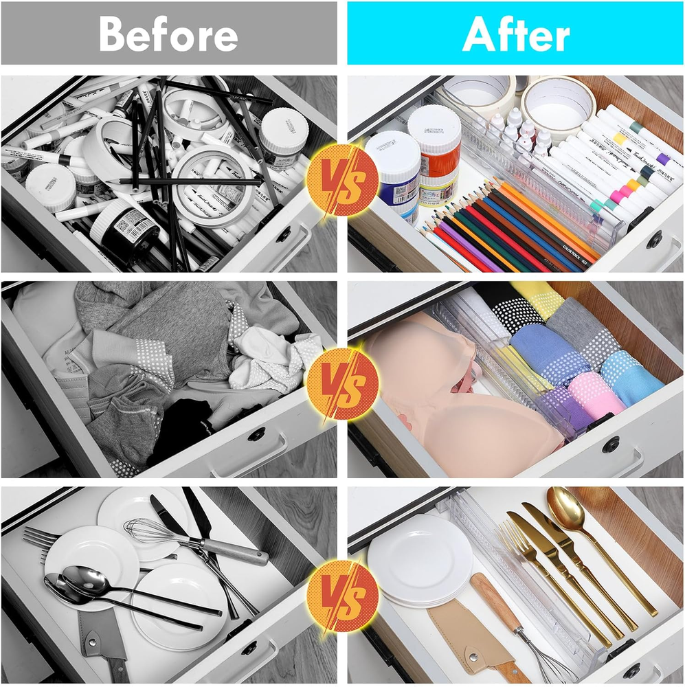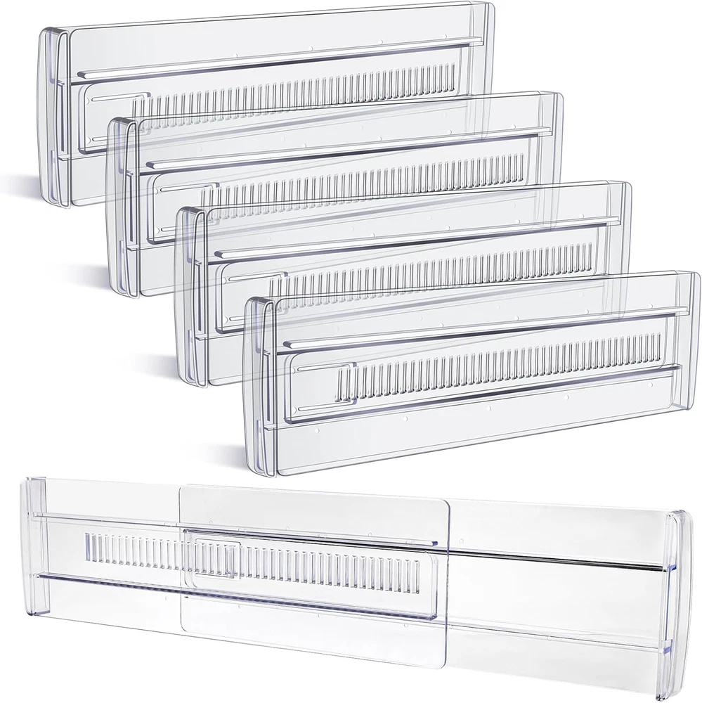 【Transparent material】The adjustable drawer dividers are made of Plastic material, which is durable and easy to clean. The transparent color can be adapted to any home without affecting the overall appearance. 【Extensible and adjustable】The bedroom drawer organizer divider can support manual length adjustment, the height is 3.2", and the extension length is from 11.3-20", practical and flexible, suitable for any drawer (please measure the actual size of the drawer before purchasing to avoid the product being unusable ). 【Easy to Install】The drawer divider for clothes is easy to use: just peel off the non-slip stickers, stick them to both sides of the divider, after stretching the divider to a suitable size, stick both ends tightly to the inside of the drawer, then install Finish. 【Extensive Storage】Multi-functional Adjustable Drawer Organisers are widely used in storage and storage of kitchen and kitchen utensils, office stationery classification, cosmetic partitions, baby clothes separation, hotels and supermarkets and other storage and finishing applications. 【Convenient Life】Clear Plastic Drawers Separators can effectively classify different items, save search time, and make the space tidy, orderly and convenient. Product Description Compare These Organizers Add to Cart Add to Cart Add to Cart Add to Cart Add to Cart Add to Cart Customer Reviews 3.9 out of 5 stars 232 4.2 out of 5 stars 47 4.2 out of 5 stars 30 3.4 out of 5 stars 3 3.9 out of 5 stars 232 3.9 out of 5 stars 232 — Price $28.99 $ 28 . 99 $17.99 $ 17 . 99 $26.99 $ 26 . 99 $38.99 $ 38 . 99 $14.99 $ 14 . 99 $9.99 $ 9 . 99 — Material PS ABS ABS ABS PS PS Carbon Steel、Plastic Color Clear White White White Clear Clear Black Number of Items 12 pack 5 pack 8 pack 12 pack 6 pack 4 pack 1 pack Length 11.3''-20" 11.6''-19.6'' 11.6''-19.6'' 11.6''-19.6'' 11.3''-20" 11.3''-20" 12.36"D x 16"W x 5.5"H Usage Bedroom,Closet,Kitchen,Office Bedroom,Closet,Kitchen,Office Bedroom,Closet,Kitchen,Office Bedroom,Closet,Kitchen,Office Bedroom,Closet,Kitchen,Office Bedroom,Closet,Kitchen,Office Kitchen 1 Retractable Lock 2 Sawtooth Spacing is Dense 3 Anti-Skid Pad Specification Size: Height 3.2in, Length 11.3in can be Extended to 19.88in 1. Note: Do not machine wash, but can be washed manually with water. 1 Clothing Storage 2 Tableware Storage 3 Office Storage 4 Dressing Storage 5 Bathroom Storage