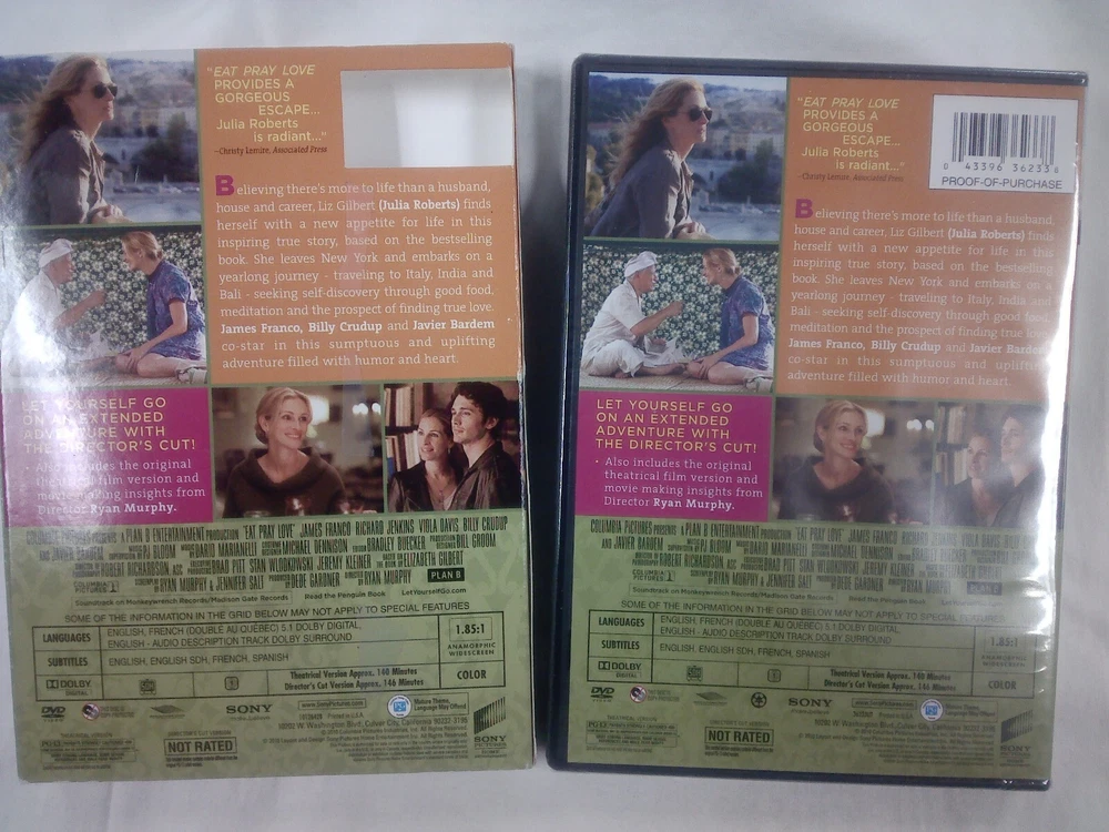 Video Format: NTSC Actor: Julia Roberts Director: Ryan Murphy ISBN: 043396362338 Case Type: Tall/DVD Case UPC: 043396362338 Format: DVD Style: Does not apply Rating: PG-13 gtin13: 043396362338 Leading Role: Julia Roberts Genre: Drama Movie/TV Title: Eat Pray Love Edition: Director's Cut EAN: 043396362338 MPN: Does not apply Type: Movie