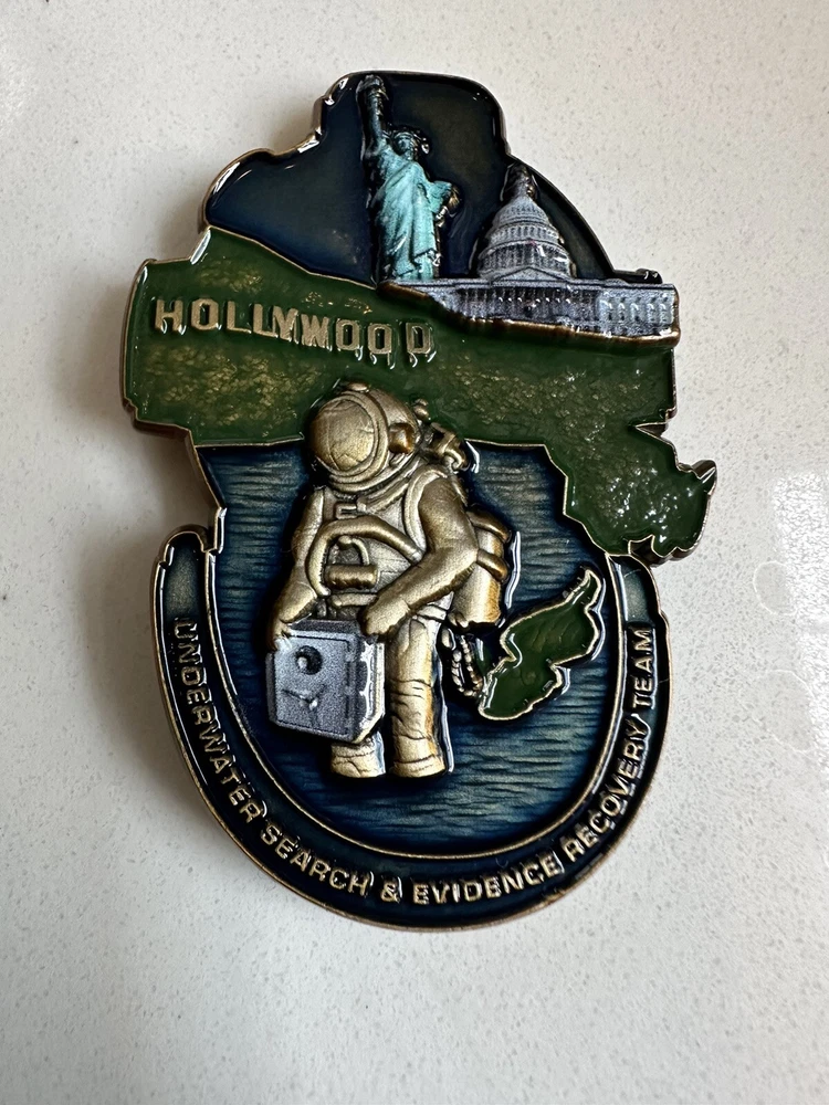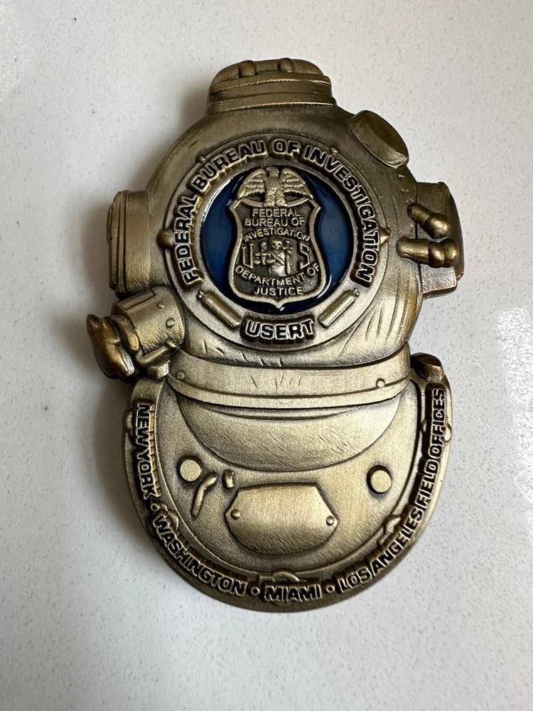 FBI Underwater Search & Evidence Recovery Team Coin. New York, Miami, Los Angeles and Washington DC all represented on the back. SCUBA Diver, Police Diver