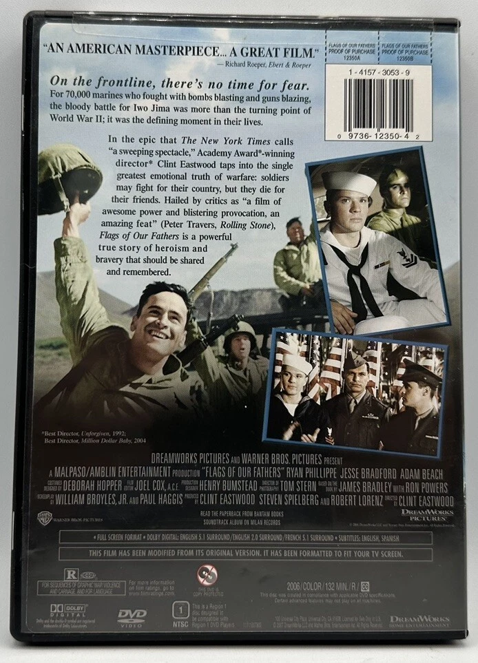 Subtitle Language: English, Spanish Studio: DreamWorks Case Type: Tall/DVD Case Actor: Jamie Bell, Ryan Phillippe, Robert Patrick Cinematic Movement: Cult Country/Region of Manufacture: United States Language: English, French Release Year: 2007 gtin13: 0097361235042 Sub-Genre: Filming, Buddy, Boxing Run Time: 132 Mins. UPC: 0097361235042 Rating: R Features: Full Screen Video Format: NTSC Season: N/A Edition: Full Screen Version Movie/TV Title: Flags of Our Fathers Region Code: DVD: 1 (US, Canada...) Type: Movie Genre: Drama Format: DVD Director: Clint Eastwood