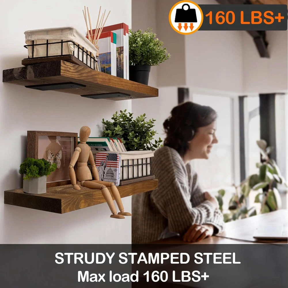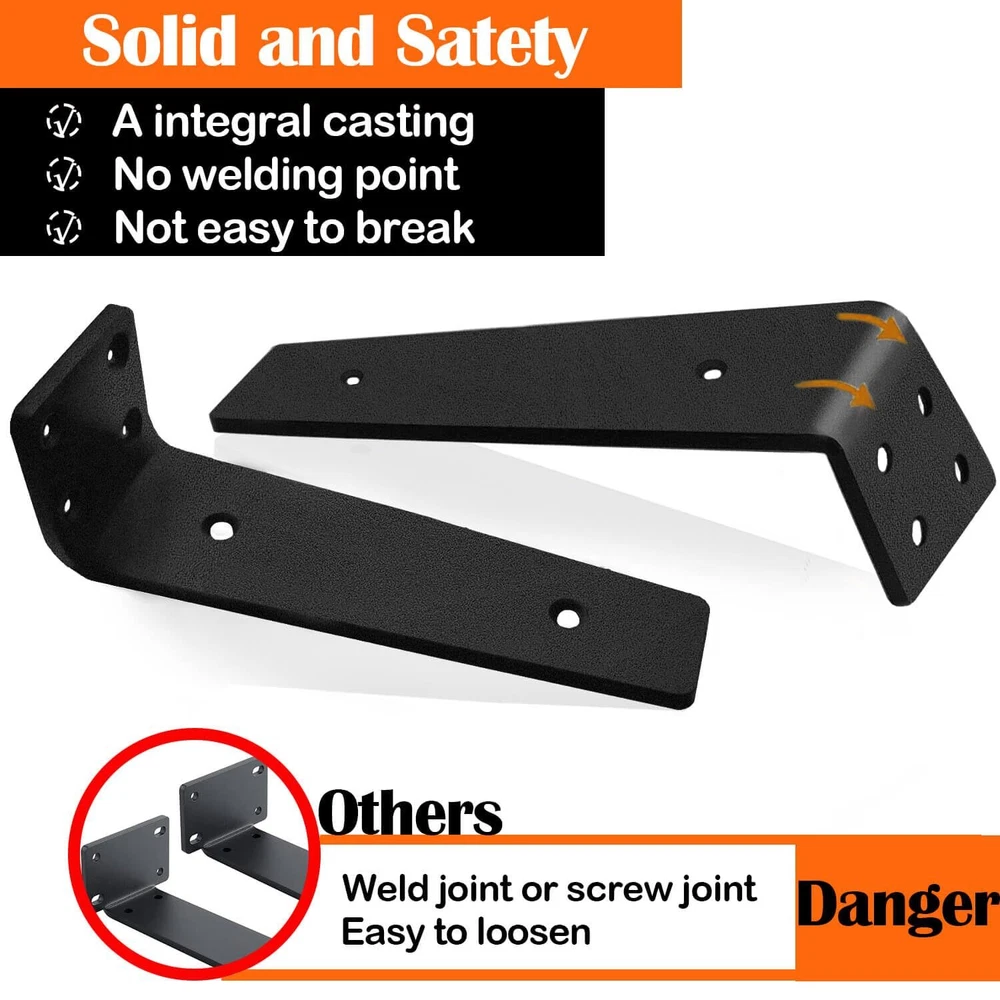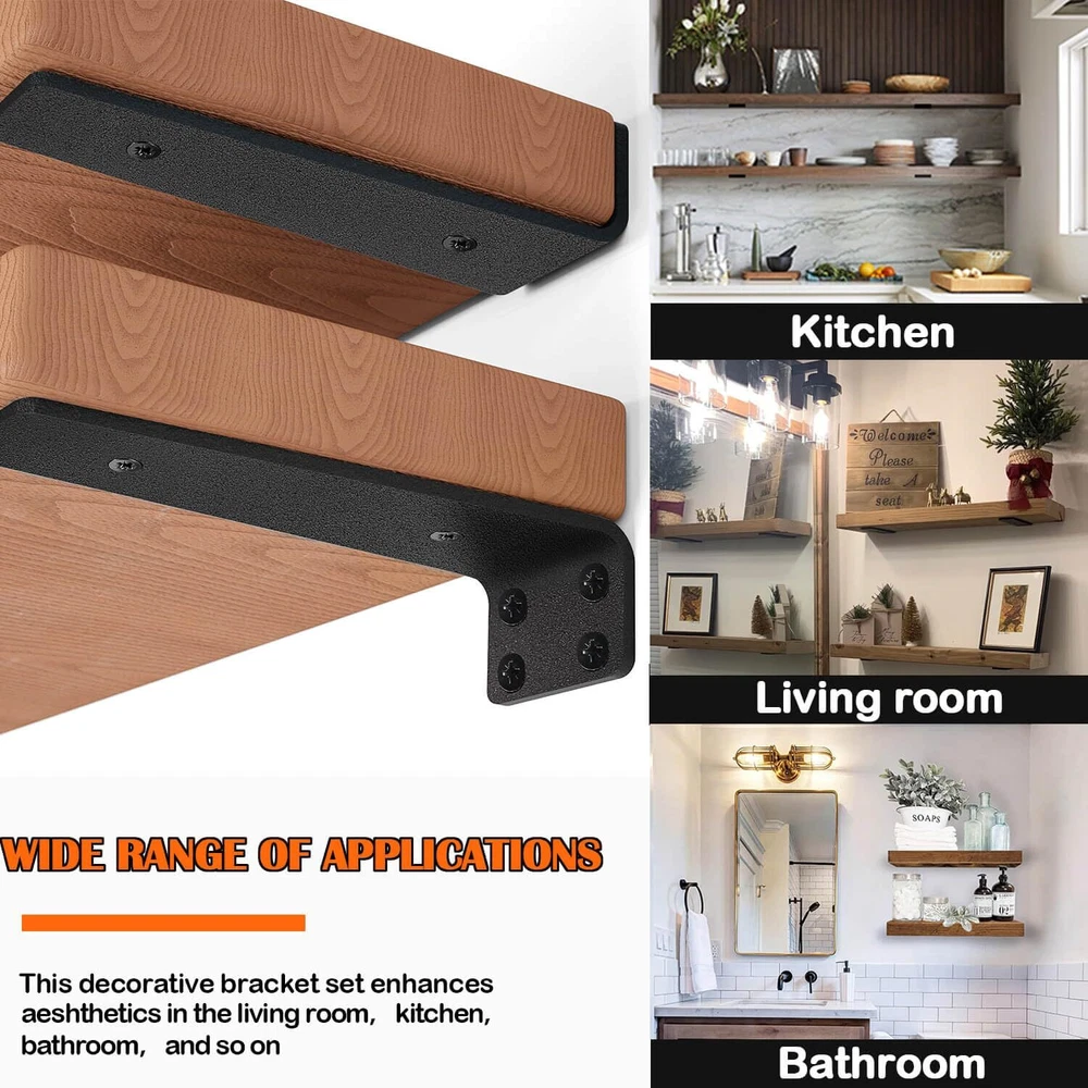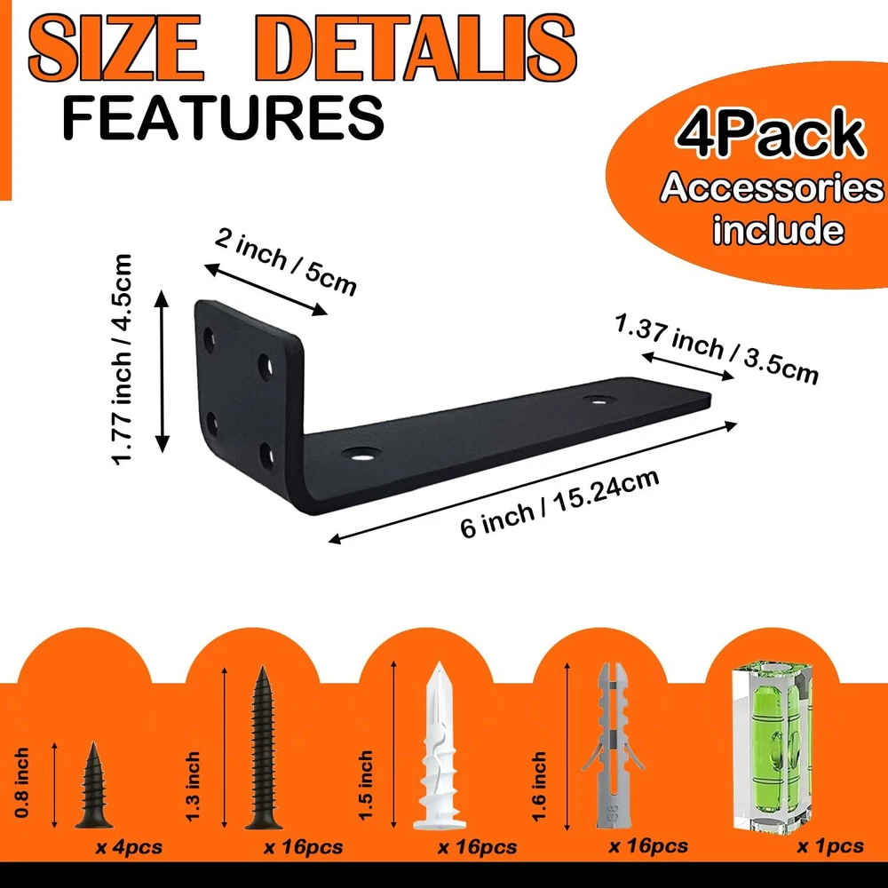 【Standardized 90° Bend】To ensure that each shelf bracket is at a maximum of 90°, we conduct rigorous testing before packing the shelf brackets. The standardized 90° design is very important as it is the objective factor in ensuring that items remain level and do not tip over after being placed on the boards (boards are not included). 【HEAVY DUTY STEEL AND DURABLE COATING】Our floating shelving hardware is made of heavy duty steel wire cut, bent as a whole, no welds not easy to break and better strength. Each pair of floating shelf brackets can hold up to 160 pounds. The surface is covered with a thick black frosted coating. On the other hand, it is more waterproof and not easy to rust, which greatly extends its service life. 【Complete accessories for easy installation】Provide all the screws needed for different wall installations and extra spare screws for unexpected situations. They enable a strong grip on the wall. A level is also included for measuring and keeping the shelf hardware balanced during installation. Detailed video installation instructions are provided. Simply follow the steps and even the inexperienced can install this wall mounted shelf bracket. 【MULTI SIZE & MULTI QUANTITY】 We provide 5 inch, 6 inch, 8 inch, 10 inch and 12 inch brackets for the floating shelves, and 4PCS,6PCS,8PCS specifications are available, according to the actual space or the size of the planks, choose the right brackets or use them in combination. 【Any Space Use】We provide 6 inch, 8 inch, 10 inch and 12 inch brackets for the floating shelves. According to the actual space or board size, choose the right size and number of brackets to use in combination. The hanging shelf brackets are not only limited to kitchen use, but also suitable for living room, bedroom, bathroom, storage room, utility room, inspection room, laundry room and garage, the best choice to make full use of space!