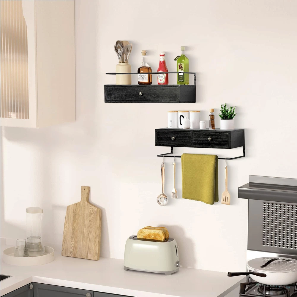【Rustic Floating Shelves with Drawer】Made of real solid wood and metal, each board retains its natural grain and color, the industrial look is simple and modern, and has applied for a design patent. Make use of the vertical space on the wall, not only increase storage space but also add decoration and beauty. Take this new design shelf back to decorate your home 【Suitable for All Occasions】 In the bathroom, the bathroom shelf can hold skincare items such as shampoo, conditioner, shower , lotions, and perfumes. In the kitchen, the wall shelf can be used to put spice and seasoning bottles. It also can be used in the dining room, bedroom, living room, and office 【Sturdy and Durable】Structure innovation is designed by our experienced designers, with good load-bearing capacity, sturdy enough to hold up to 30 lbs. The protective bar is a plus preventing anything from falling off, it can also be used to hang towels, hair hoops, headphones and other daily items 【Easy to Install】As shown in the picture, there are ways to install the floating shelves. The package include 1 clear installation manual. It only takes a few minutes to the instructions and complete the mounting, then you can create your own storage for wall 【High Quality】They are awesome wall shelves to making them perfect gifts to your family or friends. We always prioritize the needs of our users, and will improve the product based on the issues and suggestions raised by customers. Each shelf is handmade, so please rest assured to use it
