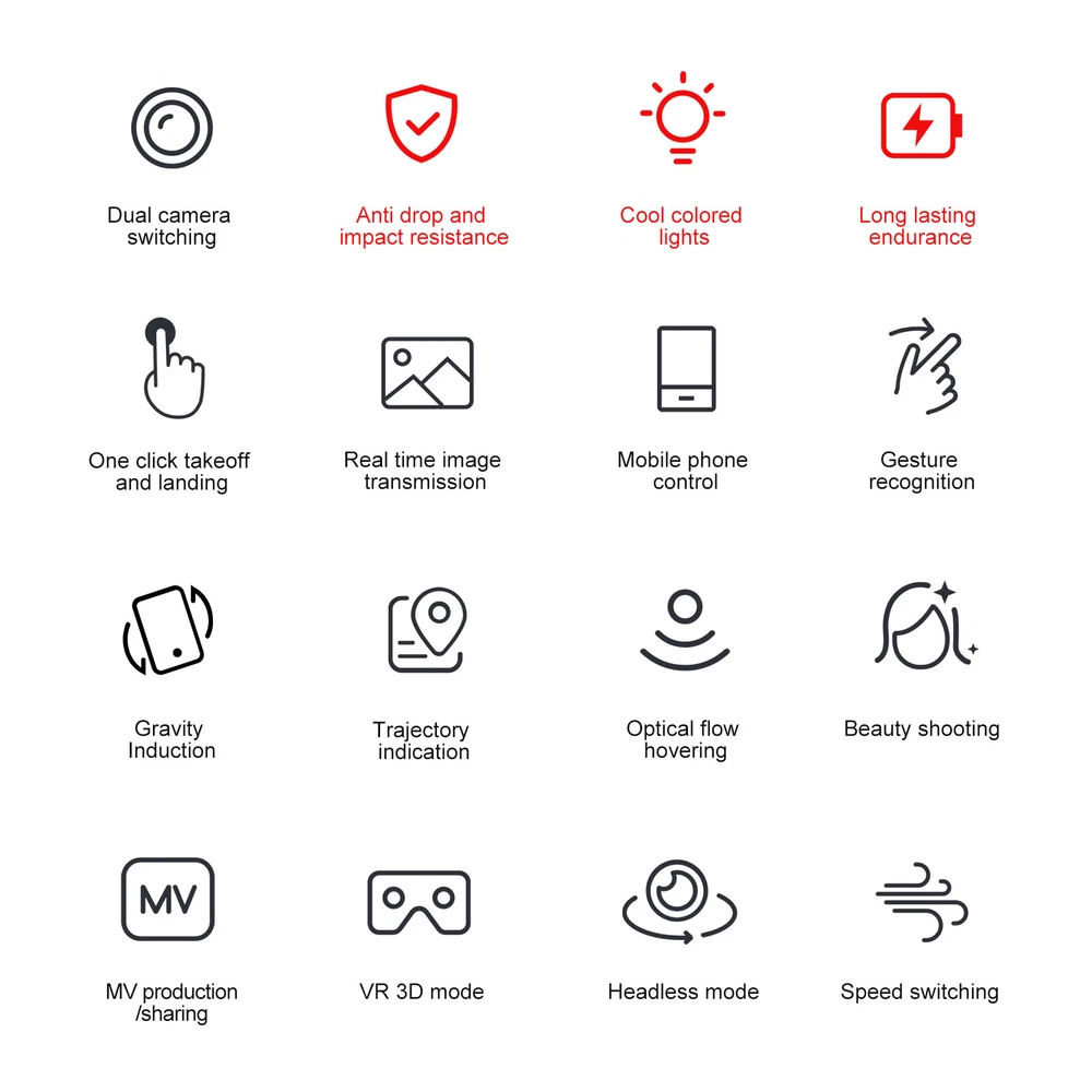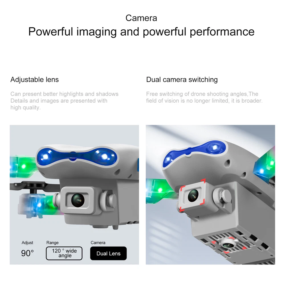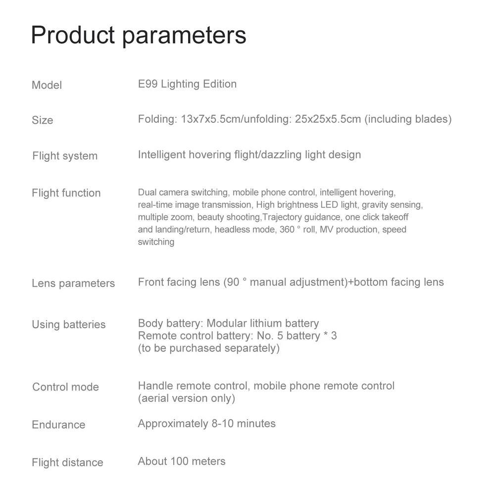 Experience the ultimate in aerial photography with this RC drone from RCtown. Equipped with a 4K dual camera, this ready-to-fly drone is perfect for both beginners and experts. With a maximum flight time of 10 minutes and a control range of 100 meters, you can capture stunning shots from a bird's eye view. The drone is easy to control and comes with a remote control for easy navigation. Its sleek design and advanced technology make it a great addition to any photographer's collection. This unit weighs only 33g and is available in a pack of 5. Perfect for capturing stunning shots and creating memorable videos, this drone is a must-have for anyone interested in aerial photography. Name RC Drone Item NO: E99 Pro Frequency: 2.4G/5G Channel: 4CH Motor: 816 Coreless Motor 360: Stunt Show