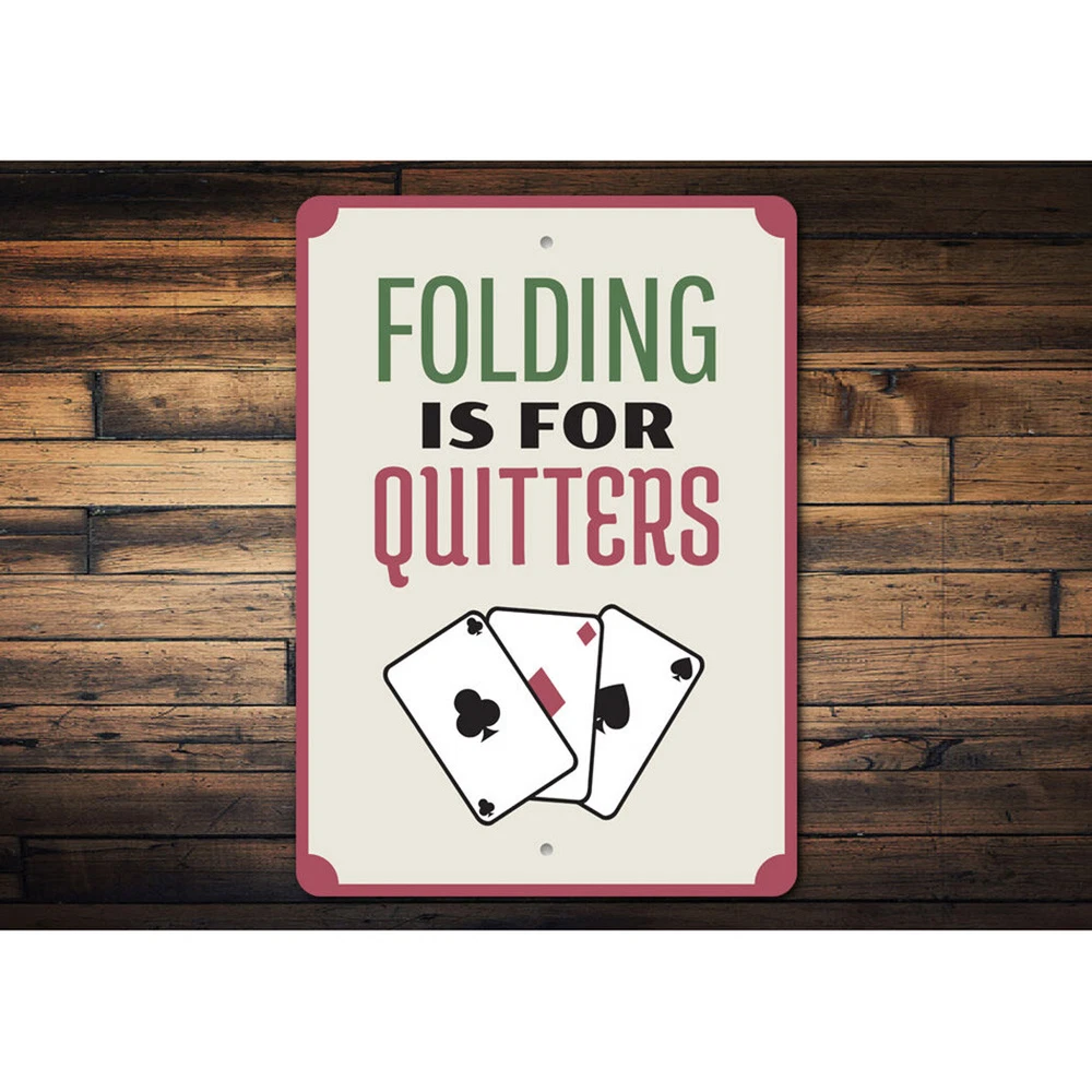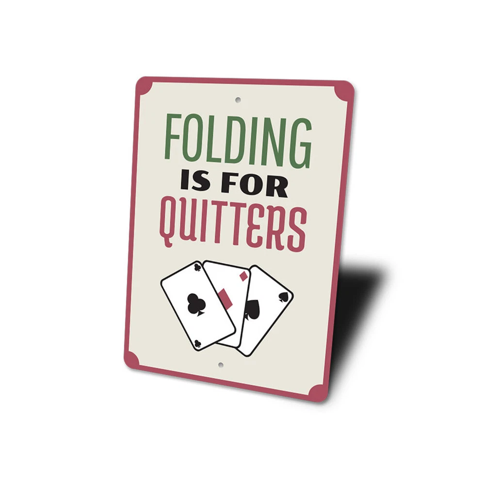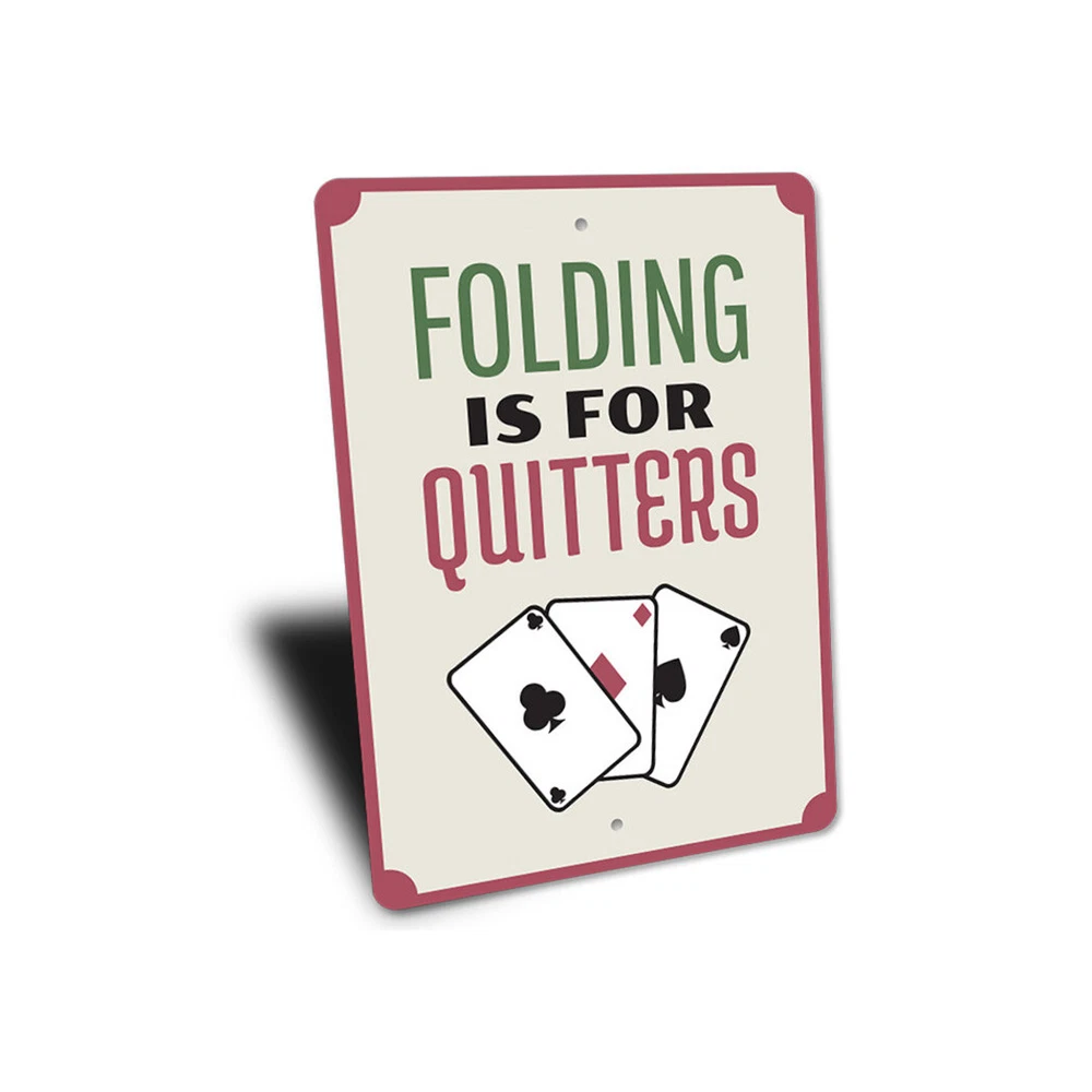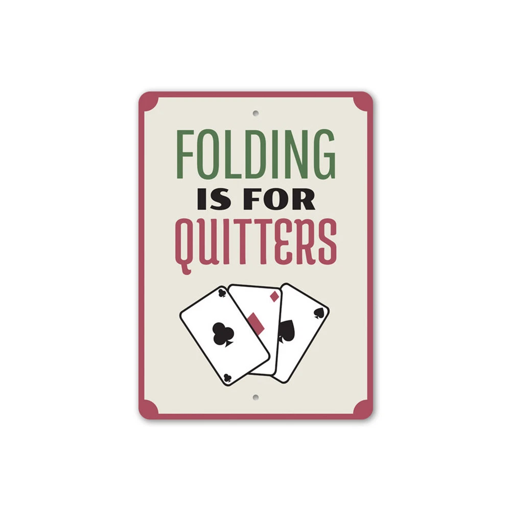The Lizton Sign Shop Product Description Folding is for Quitters, Playing Cards, Gameroom Sign, Man cave Wall Metal Sign **there may be slight variations in color and text spacing, however your sign will be very similar to the image above. Quality Aluminum Street Signs Sign Information Aluminum Brand New Sign Comes with rounded corners and pre-drilled for easy hanging. We use the highest quality materials - 100% USA-made! Great Gift Idea - Our signs truly make a one of a kind gift. Personalize the sign with the text you want to add. Custom text for the sign can be sent to us via email. A BRAND NEW SIGN!! All of our street signs are made of premium materials. The sign itself is made of aluminum and will never rust providing years of enjoyment indoors and outdoors. No Cheap plastic!! The Lizton Sign Shop specializes in quality personalized custom aluminum signs for any occasion. These make the perfect sign for any man cave, office, basement, garage, college dorm, kids bedroom, game room, bar, pub, tavern or countless other places. *Colors may vary slightly from one computer screen to the next but the image should be very close. All content and designs are subject to copyright and may not be reproduced in any form. Payment Methods We would prefer payment to be made through paypal but we also accept all major credit cards. If you select the credit card option please contact us after you make your purchase and we can walk you through the steps to make a secure payment. Return Policies We will accept returns within 30 days of the purchase date. The buyer is responsible for any costs to return the item or items. Returns will only be accepted for items that were damaged in shipping or if we made an error in the manufacturing of your item, i.e. spelling error.