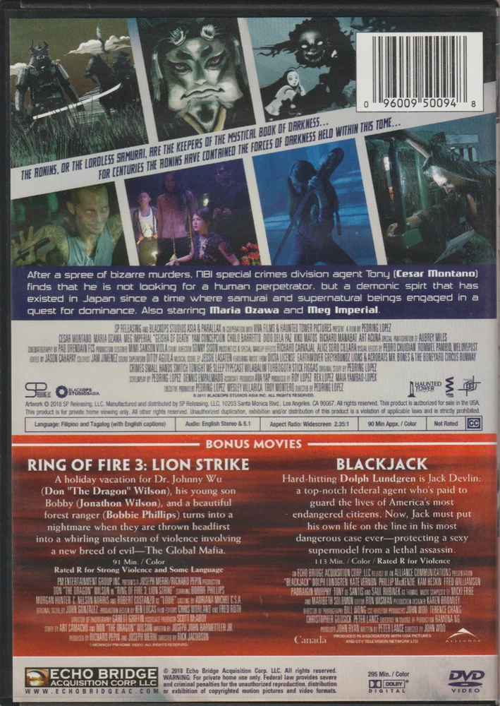 GEISHA OF DEATH DVD, 2015, INCLUDES 2 BONUS MOVIES BLACKJACK & RING OF FIRE 3 LION STRIKE. Cesar Montano, Meg Imperial, Maria Ozawa, Cholo Barretto, Kiko Matos, Rudy Ruiz, Dido dela Paz, Richard Manabat, Arthur Acuna, Yam Concepcion, Bing Villegas, Aubrey Miles, Lui Manansala, Alchris Galura, Benson Dalina, Sacho Yoshi, Tony Balmonte, Noel Blanco,. NBI special crimes division agent Tony (Cesar Montano) encounters an evil entity which is bent on killing and torturing beautiful women, including his girlfriend, yeas after he thought he had killed the malevolent spirit. People close to Tony are in danger, including his partner Jane (Meg Imperial), whose romantic interest in him is known by everyone in the agency except him. The spirit, who has killed many people in Japan, is thought to be targeting women from a certain Samurai clan. In Manila, Miyuki (Maria Ozawa), who takes care of the family business while her younger sister tends their aging father, is later forced to help in the investigation regarding the murders, after Akane goes missing and their father is found dead, to stop the evil entity's killing spree. Director Pedring Lopez-Action-Crime-Horror-Mystery-Thriller-Rated MA.
