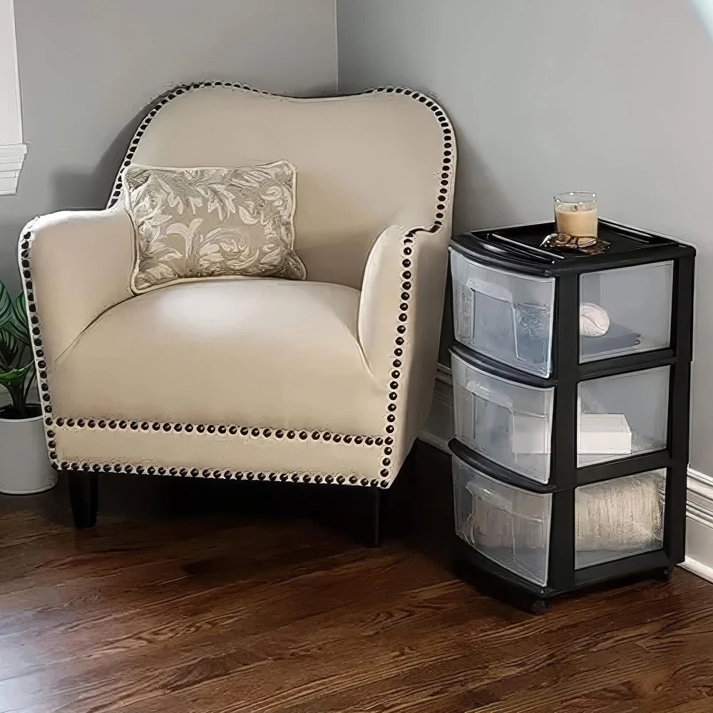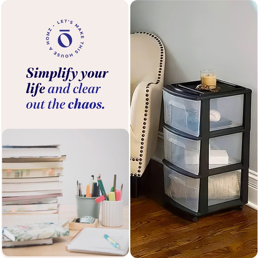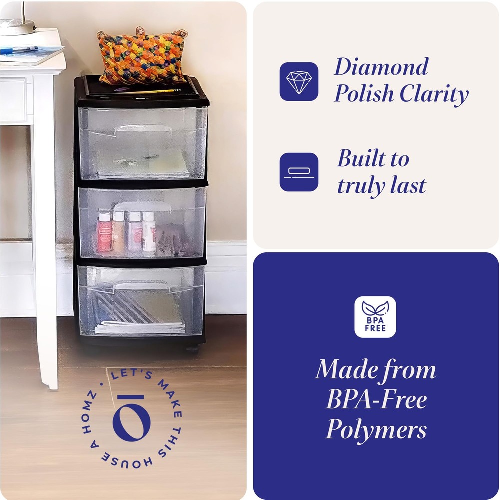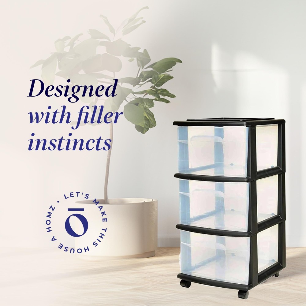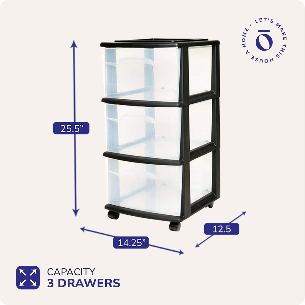 Cart Masterpiece: Perfect the art of hiding your chaos with the HOMZ storage carts with drawers. This plastic drawer cart is made to fit anywhere you need organizing power, whether at home or work. For Small Spaces: This roomy plastic organizer measures 12.5" L x 14.25" W x 25.5" H with the interior of each drawer measuring 12.31" L x 9.92" W x 6.85" H. It Will Fit: Our rolling drawer organizer cart features clear plastic materials and removable wheels for easy transportation. Use them to store toiletries, office supplies, crafts, and more. From Trash to Treasure: Life in plastic is fantastic when the plastic is made from 90% recycled materials. We know the earth is important to you, so our cart is good for your items and the planet. HOMZ for Your Home: From organization to storage, we have the container that you are looking for. Allow us to make your house a HOMZ.