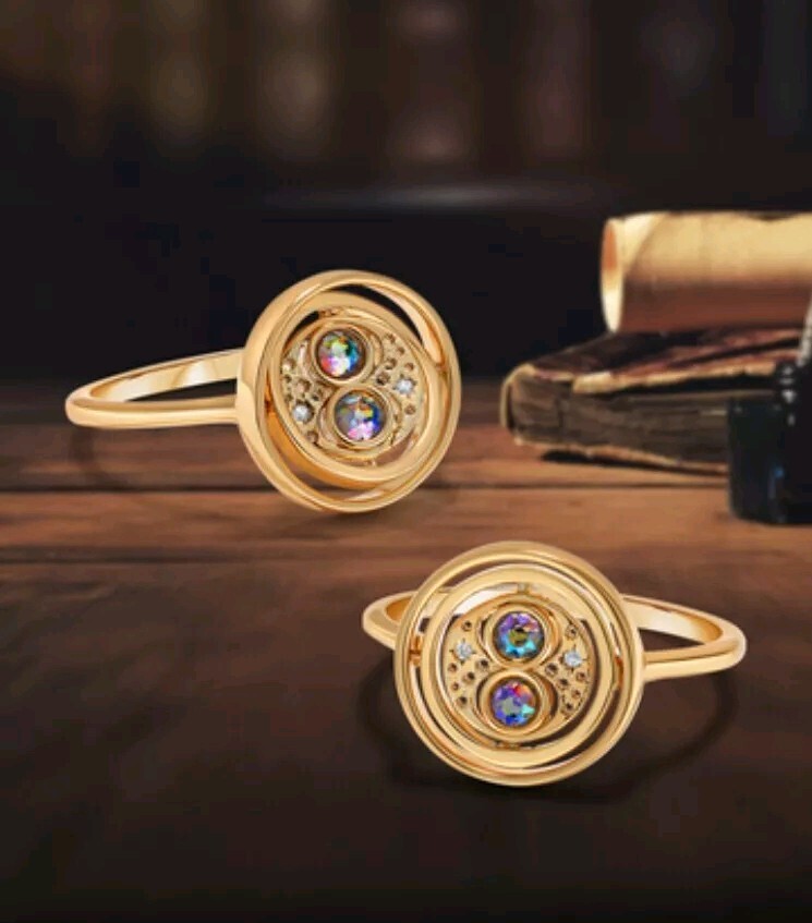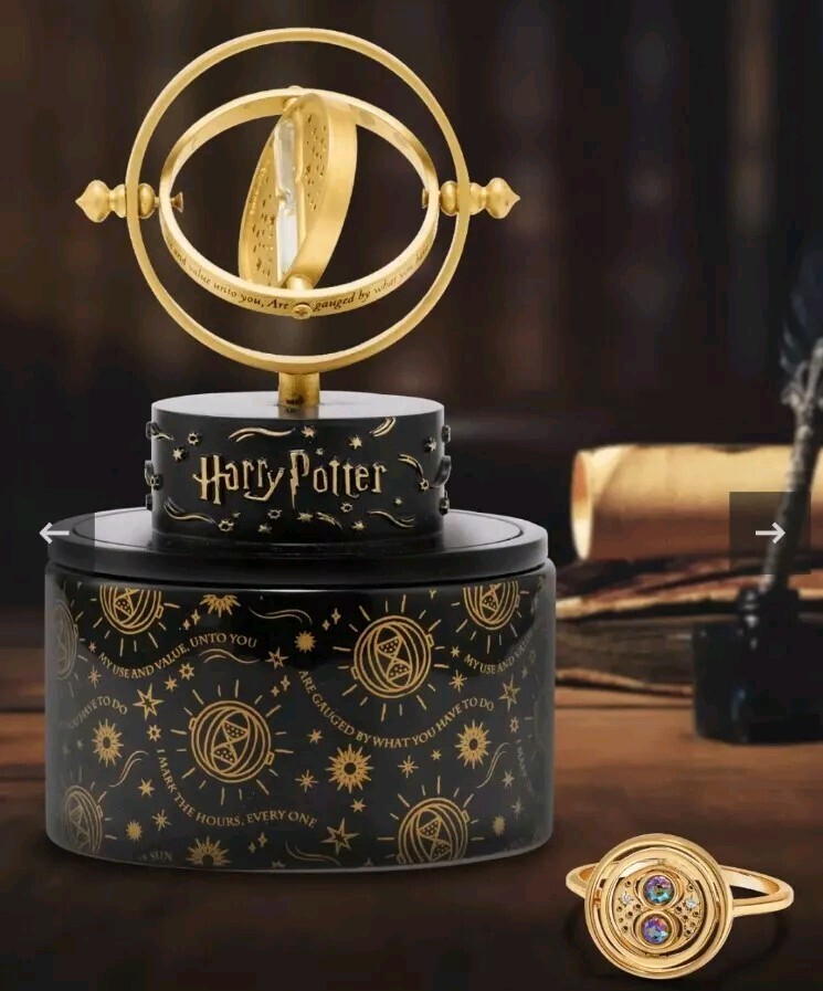 Harry Potter Time Turner Candle + Jewelry Tray - Time Turner Ring Collection ***Please send a message with your ring size to personalize the rings.*** Jewelry Find a Harry Potter Time Turner ring inside this jewel candle! Fragrance "I mark the hours, everyone, Nor have I yet outrun the Sun. My use and value, unto you, are gauged by what you have to do." Light this special edition jewelry candle and enjoy a fruity, floral blend of golden apple, juicy pineapple, nectarine blossom, and sun-warmed driftwood. After you finish burning, reveal a limited edition Time Turner ring inside. How It Works Light your jewelry candle and enjoy the amazing, long-lasting fragrance. When you've finished burning, reveal your jewel inside! As a bonus, re-use this candle jar as a decor piece for your home or to keep your favorite trinkets in. This jewelry candle makes a great gift idea for any Harry Potter™ fan! Candle Size 6.0 oz. / 170 grams - 2 wick candle Protection Jewelry is sealed in a protective bag and enclosed in silver foil. Thank you for your order!
