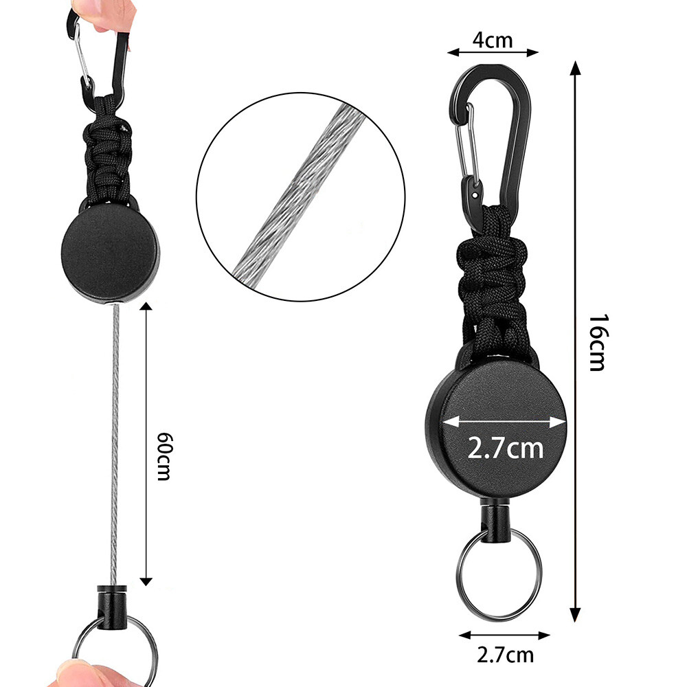 Product Description Color:Black//Orange/Green Material: Alloy+Plastic Holder Diameter: 4cm Key Chain:16cm Wire Length: approx.60cm Wire Thickness: about 1.0mm Package Included: 1/2/3PCS Retractable Keyring Carabiner Clip