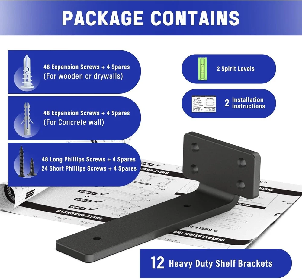 Packaging: Flat Pack Additional Parts Required: No Item Width: Floating Shelf Brackets Item Length: Floating Shelf Brackets Room: Living Room, Kitchen, Bedroom, Bathroom, Storage Room, Utility Room, Checkroom, Laundry Room Distance from Floor to Bottom: 6 in Suitable For: Books Item Depth: 3.94 Inches Batteries Included?: No Size: 6 Inch Mounting: Wall Mounted Door Mechanism: Open Face Type: Bracket Shelf Batteries Required?: No Assembly Required: Yes Features: Heavy Duty, Waterproof, Rust Resistant, Easy to Install, Standard 90° Design Shape: Rectangle Finish: Frosted Personalized: No Style: Industrial Department: Adults Finish Type: Frosted Coating Material: Iron, Metal Item Dimensions L X W X H: 7.48 X 3.94 X 8.07 Inches Maximum Weight per Shelf: 160 lb UPC: Does not apply Mounting Type: Wall Mount Number of Shelves: More Than 6 Color: Black Number of Items in Set: 12 Included Components: Floating Shelf Brackets Maximum Weight Capacity: 160 lb Required Tools: No Tools Required gtin13: Does not apply Product Dimensions: 7.48 X 3.94 X 8.07 Inches Brand: Unbranded Item Height: Floating Shelf Brackets Set Includes: Shelf Brackets, Mounting Screws, Installation Instructions, Spirit Level Item Weight: 10.52 lb