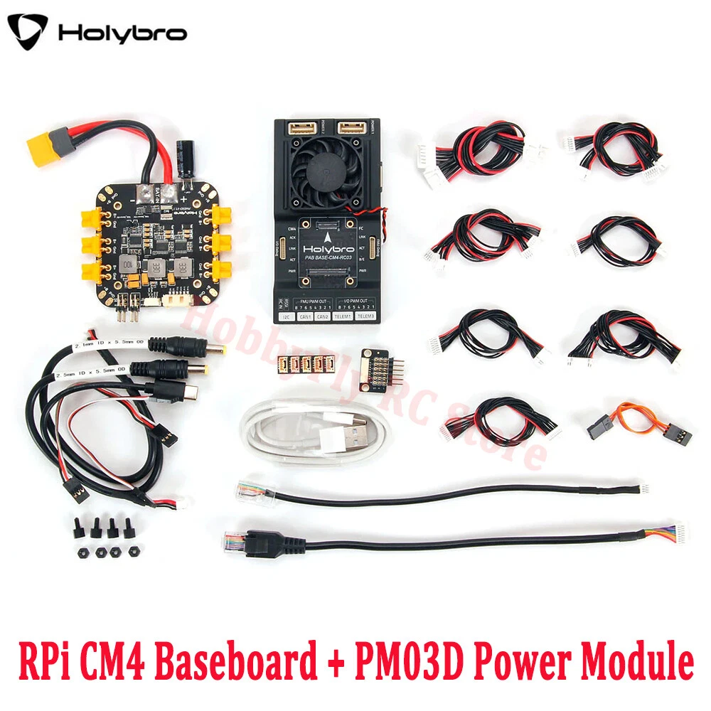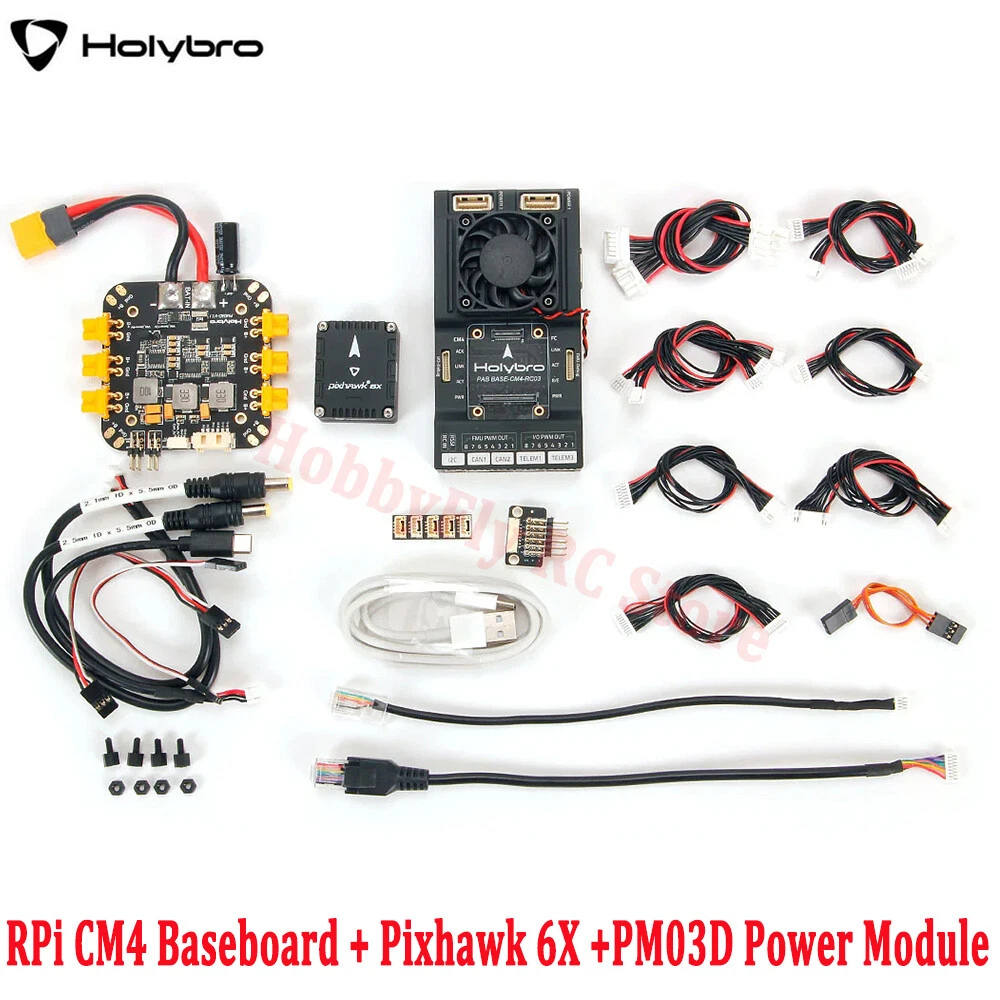Description The Holybro Pixhawk RPi CM4 Baseboard combine the Pixhawk FC module with the Raspberry Pi CM4 companion computer in on compact form factor with all the connections you need for development. It follows the Pixhawk Connector and Autopilot Bus Standard, allow easy swap of FC Module with any FC that follows the Pixhawk Bus Standard. The FC Module is internally connected to RPi CM4 through TELEM2, and can also be connected via ethernet with a external cable provided. It is compatible with the Pixhawk 5X & 6X flight controller module. User guide & other technical detail can be found on our Documentation Page Here. SKU20188 Includes: Pixhawk RPi CM4 Baseboard Note: Does not include Flight Controller Module & RPi CM4 PM03D Power Module Pixhawk RPi CM4 Baseboard Cable Set SKU20189 Includes: Pixhawk 6X Flight Controller Module PM03D Power Module Pixhawk RPi CM4 Baseboard Note: Does not include RPi CM4 Pixhawk RPi CM4 Baseboard Cable Set SKU31107 Includes: Rasberry Pi CM4 RAM: 8GB eMMC: 32GB Wireless: No Recommend specification for RPi CM4: Wireless: Yes RAM: 4GB or higher eMMC: 16GB or higher