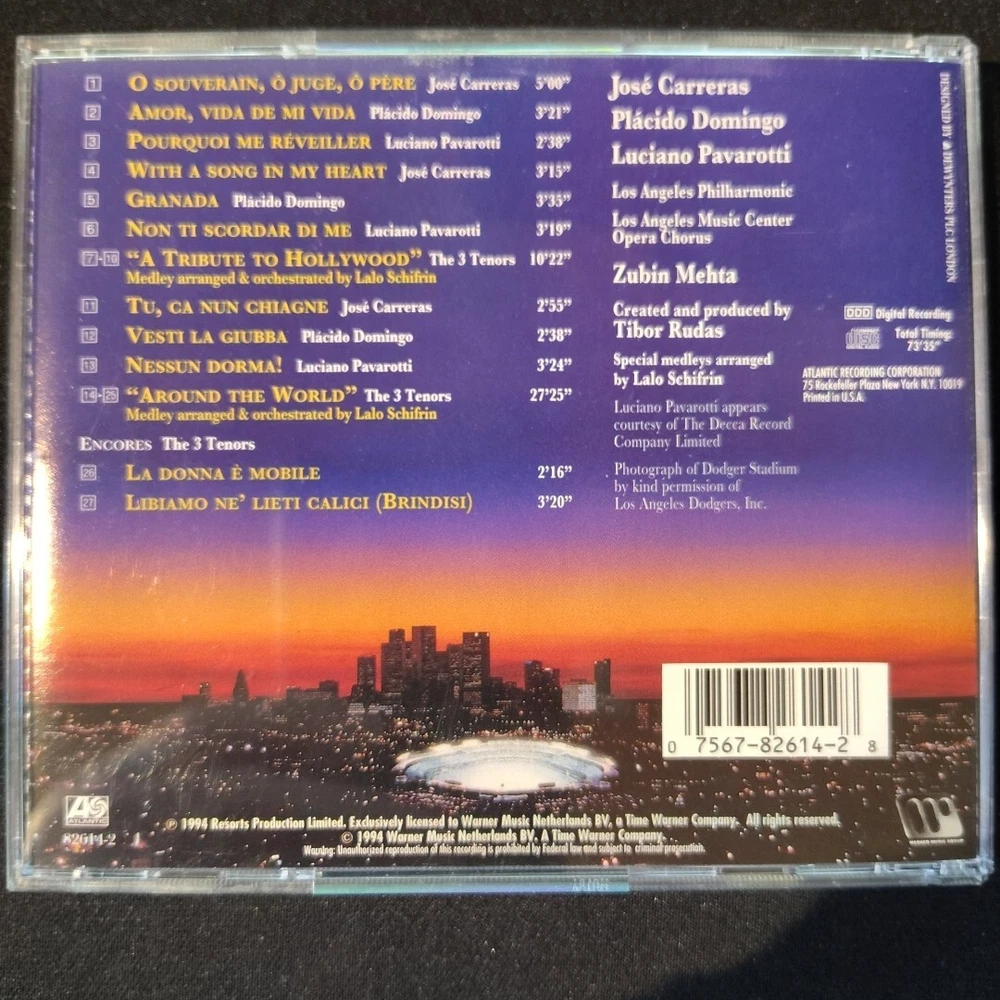 Experience the enchanting classical music with the gold-stamped CD "In Concert 1994" by Pavarotti, Domingo, and Carreras. This CD is a must-have for any music lover who enjoys the soothing melodies of classical genres. The album was released in 1994 under the ATL and Atlantic record labels, and was produced by Christopher Raeburn and Tibor Rudas. This CD features the amazing vocals of the three renowned artists and is a perfect addition to any music collection. The gold-stamped edition adds a touch of elegance and makes this CD a unique item for collectors. Don't miss out on the opportunity to own this beautiful piece of classical music history.
