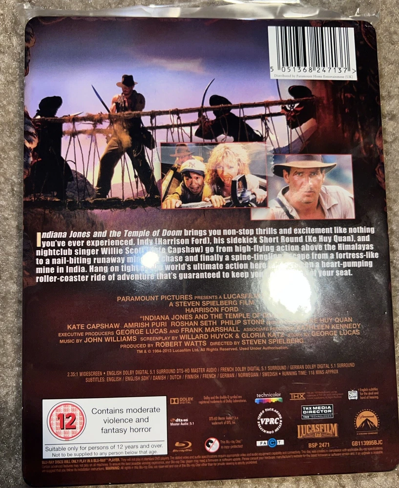 Genre: Action, Adventure Edition: Limited Edition, Steelbook Actor: Harrison Ford Country/Region of Manufacture: United Kingdom Movie/TV Title: Indiana Jobes And The Temple Of Doom Format: Blu-ray UPC: 5051368247137 Type: Movie gtin13: 5051368247137