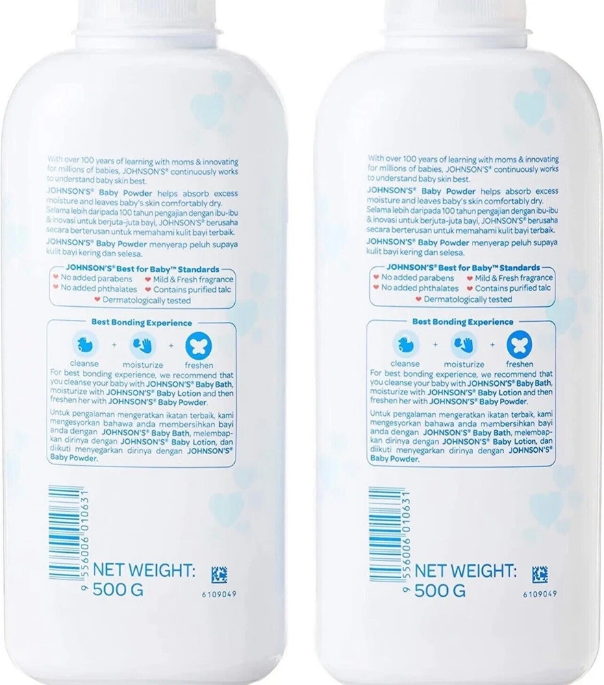Free eBay listing template designed by dewiso.com Johnson's Baby Powder Original TALC 500g / 17.6 oz (Pack of 2) Johnson's Baby Powder Original TALC 500g / 17.6 oz (Pack of 2). Johnson's Baby Powder helps to eliminate friction while keeping skin cool and comfortable. It’s made of millions of tiny slippery plates that glide over each other to help reduce the irritation caused by friction. Leaves baby's skin feeling smooth and fresh. Powder absorbs excess moisture, which can provide a growth environment for bacteria, leading to skin rashes and irritation. Powder helps eliminate friction and chafing where body parts rub against each other, such as the neck, groin, and other creases. Powder provides a barrier that helps keep your baby feeling fresh and free from unnecessary moisture.
