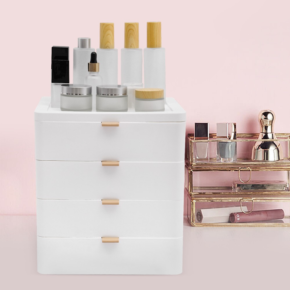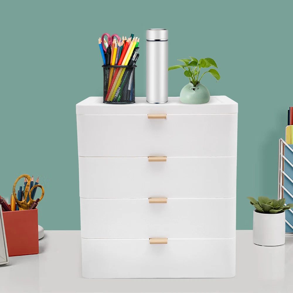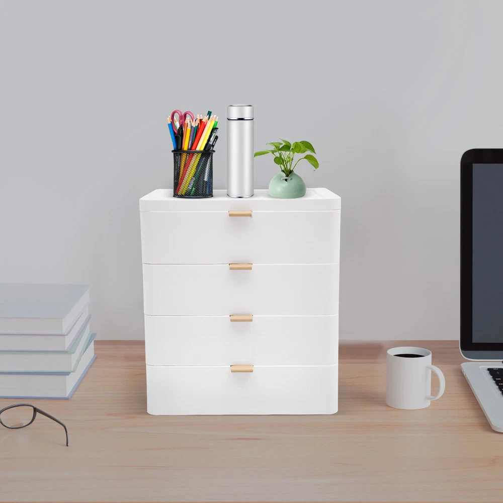 Description This desktop storage box can effectively store a variety of items such as office supplies, school supplies, and cosmetics. The 4-drawer design and top platform can make full use of the storage space and keep items neat and orderly. If you want to improve the tidiness of your home space, add beauty, and bring convenience and comfort to your life, then it is an indispensable little helper for you. Details Convex Edges: The convex edges on the top prevent items from rolling off or creating desktop clutter. Comfortable Handles: They allow you to push and pull the drawers more smoothly. Rounded Corners: They can protect your hands from being scratched during use and also enhance the aesthetics of the product. Specification Material: PP Color: White Style: Modern Shape: Rectangular Assembly Required: No Mounting Type: Tabletop Mount Room Type: Home, Office Number of Tiers: 4 Drawers + 1 Top Platform Load-bearing Capacity: About 5kg/11.02lbs Product Size: 26*20.2*29cm/10.24*7.95*11.42in Package Size: 28*22*31cm/11.02*8.66*12.2in Gross Weight: 1.5kg/3.3lbs Net Weight: 1.3kg/2.9lbs Package Included 1* Desktop Storage Box Notes Please allow the slight color difference caused by the shooting light and 1-3cm error due to manual measurement and make sure you do not mind before ordering. Sturdy and Durable: This product is made of high-quality PP, impact-resistant, and anti-rust, ensuring long-term use. Tidy and Organized: 4 drawers can be sorted to organize tissues, books, data cables, cosmetics, and other daily necessities, creating a cleaner and tidier desktop environment. You can also place frequently used items such as lotions, pens, and notepads on the top platform, so you can access them instantly. Suitable Loading Capacity: The solid PP material and stable rectangular structure provide this item with a suitable bearing capacity(about 11.02 lbs), so you can use it to store your daily cosmetics without worrying about collapse. Space-saving: It is compact (10.24*7.95*11.42in)and stackable, so you can put it on a table and make full use of vertical space, providing you with more storage space and improving space utilization. Stylish Appearance: The white color scheme and rectangular shape highlight the unique image of the product as simple and modern, suitable for most of the decorative styles of the room, and is a good desktop decoration. Effortless to Clean: Simple construction, smooth surfaces, and pull-out drawers make this product easy to clean, you just need a wet towel to easily remove dust. Exquisite Gift: With a beautiful appearance and practical function, it would be a wonderful surprise for your wife, mother, daughter, friend, or loved ones. Guaranteed Customer Service: We aim to provide quality products and services. If you have any problems, please feel free to contact us. We will reply and solve the problem for you as soon as possible.
