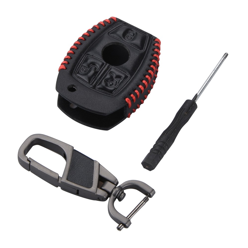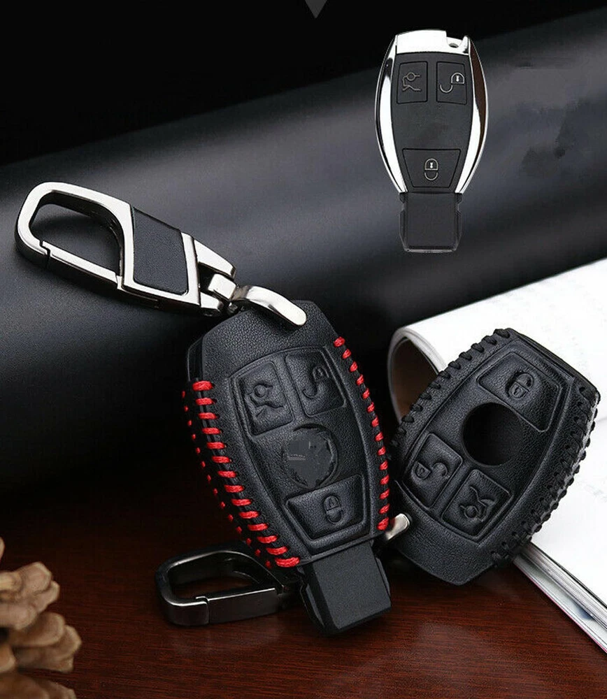 Leather Key Fob Holder with Chain for Mercedes Benz E-Class Remote Key Case 3 Buttons Cover Bag