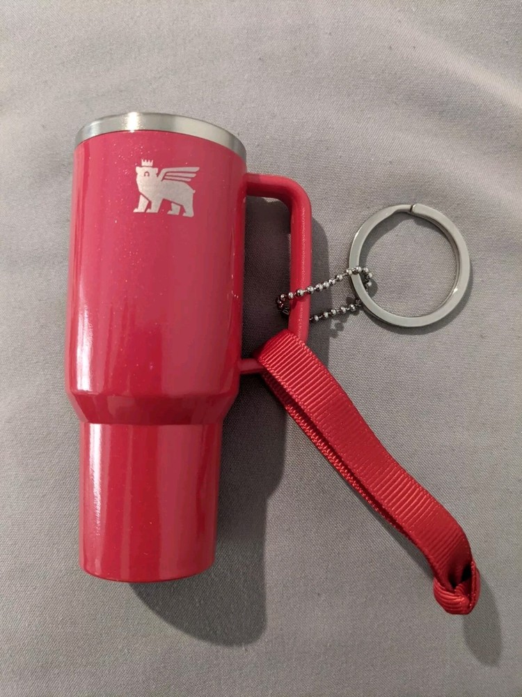 This limited edition Stanley Mini Quencher Ornament Keychain in Red Delicious features a modern design with a red color scheme. Made of plastic, it includes a keychain attachment for convenience and is themed after Stanley tumblers. Perfect for collectors or those seeking a stylish and functional key accessory.