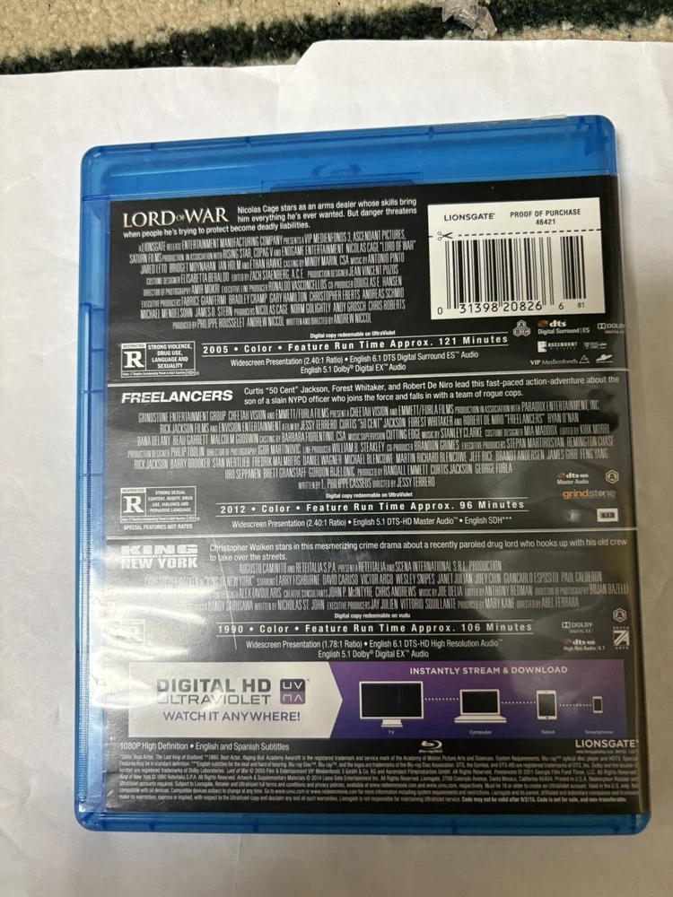 Actor:Christopher Walken, David Caruso, Ethan Hawke, Forest Whitaker, Jared Leto, Nicolas Cage, Robert De Niro, Curtis 50 Cent JacksonRating:Rgtin13:0031398208266Language:EnglishUPC:0031398208266Movie/TV Title:Lord of WarGenre:Action, Adventure, Crime, DramaFormat:Blu-ray