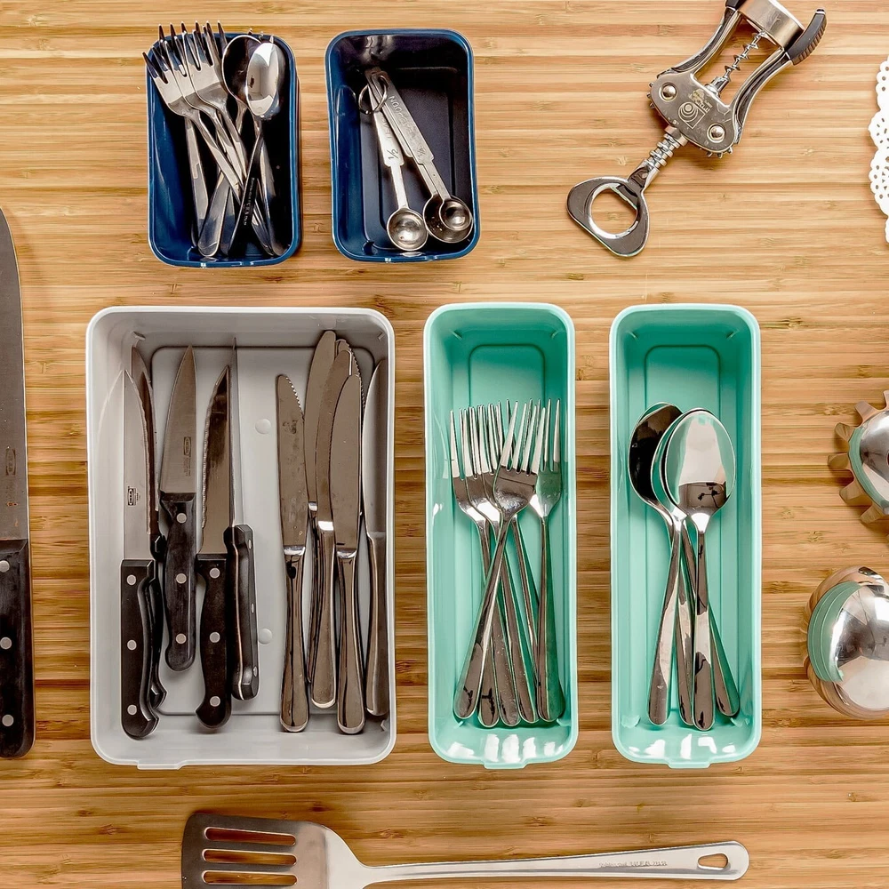 About this item Product details Perfect for storing all kinds of household items, this set of five Mainstays Flex Bins helps to keep your home more organized. With a solid wall design that keeps items securely contained, this set of five dishwasher-safe organizers are made of a flexible material to be perfectly sized for use individually or as a group that fits inside most standard sized drawers. These trays feature a lift tab for easy removal and are perfect for storing office supplies, kitchen items and small gadgets, tools and parts for repairs, scissors, spare change, and a variety other items almost anywhere. Each set includes two bins measuring 3.5 wide by 5.3 inches deep by 3 inches high, two bins measuring 3.5 inches wide by 10.6 inches deep by 3 inches high, and one bin measuring 7 inches wide by 10.6 inches deep by 3 inches high. Built for a long life of use in your home, keep everything tidy with this set of five Mainstays Flex Bins. Getting organized is often a matter of finding the right equipment to store your stuff. Mainstays organization and storage products are suitable for use throughout your home. Some of the products in this section are designed for use in a specific area, such as your closets or kitchen, and you can focus on these specific products if you know what you need. If you don't yet know what organization and storage products might solve your problems, scroll through the product listings in this section to get inspiration. Product descriptions and names are helpful guides to consider as you browse. Mainstays Flex Bins, Set of 5 Each set includes two bins measuring 3.5" W x 5.3" D X 3" H, two bins measuring 3.5" W x 10.6" D x 3" H, and one bin measuring 7" W x 10.6" D x 3" H A great system for organizing your home Crafted of a flexible material that creates the perfect fit anywhere Solid wall design keeps items securely contained Lift tabs make removing and transporting easy Dishwasher safe for easy care Perfect for storing office supplies like staples, paper clips, pens and more Makes a great kitchen accessory for toothpicks, cutlery, spare change, and small gadgets Can be used in workshops and garages for fasteners, small tools, and parts for repairs Total product weight: 0.93 lbs