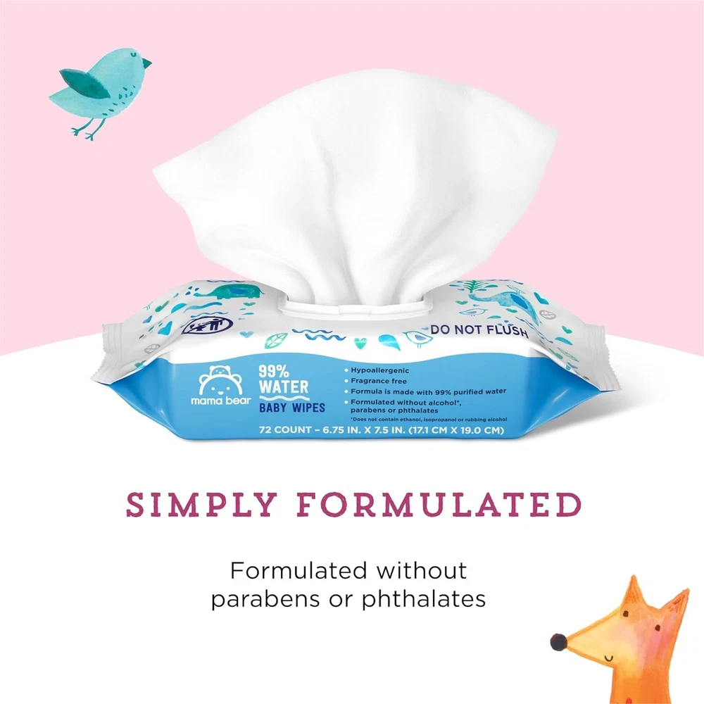 Mama Bear 99% Water Based Baby Wipes, Hypoallergenic for Sensitive Skin, Fragrance Free, 432 Count (6 Packs of 72) Mama Bear 99% Water-Based Baby Wipes, Hypoallergenic for Sensitive Skin, Fragrance-Free, 432 Count (6 Packs of 72) - Free & Fast Delivery Ensure the best care for your baby with Mama Bear 99% Water-Based Baby Wipes. These hypoallergenic, fragrance-free wipes are perfect for sensitive skin, providing gentle and effective cleaning. With 432 wipes in 6 packs of 72, you'll always have a fresh supply on hand. Enjoy the convenience of free and fast delivery. Formula is made with 99% water Hypoallergenic and fragrance free Formulated without alcohol*, parabens or phthalates (*does not contain ethanol, isopropanol or rubbing alcohol) Made with plant based FSC Certified fiber wipes Gentle wipes for newborns and up Safe for cleaning all around baby including bottom, hands, and face DO NOT FLUSH. Dispose of used wipes in trash receptacle. Store at room temperature. Close lid tightly to retain moisture. Packaging made with at least 25% Post Consumer Recycled Material Features: 99% Water-Based: Made with 99% water for a natural and gentle clean. Hypoallergenic: Safe for even the most sensitive skin, minimizing the risk of irritation. Fragrance-Free: No added fragrances, ensuring a pure and gentle clean. 432 Count: Includes 6 packs of 72 wipes each, providing a total of 432 wipes. Soft and Strong: Gentle on baby’s skin yet strong enough to handle messes. Resealable Packs: Keeps wipes moist and fresh for every use. Benefits: Gentle Cleaning: Ideal for babies with sensitive skin, ensuring a gentle clean without irritation. Convenient Packaging: Resealable packs keep wipes fresh and are easy to use with one hand. Long-Lasting Supply: With 432 wipes, you’re well-stocked for all your baby’s needs. Versatile Use: Perfect for diaper changes, hand and face cleaning, and general cleanups. Travel-Friendly: Compact packs are easy to carry in diaper bags, strollers, and cars. Uses: Diaper Changes: Keep your baby clean and fresh during diaper changes. Hand and Face Wipes: Gentle enough for cleaning your baby’s hands and face. On-the-Go Cleanups: Convenient packs for quick cleanups while traveling or out and about. Multipurpose Cleaning: Can be used for general cleaning needs around the house. Specifications: Brand: Mama Bear Product Name: 99% Water-Based Baby Wipes Formula: Hypoallergenic, Fragrance-Free Count: 432 wipes Packs: 6 packs of 72 wipes Total Wipes: 432 Delivery: Free & Fast Delivery Provide your baby with the gentle and effective cleaning of Mama Bear 99% Water-Based Baby Wipes. Order your pack of 6 today and enjoy the convenience of free and fast delivery, ensuring you always have a fresh supply of wipes for your little one!