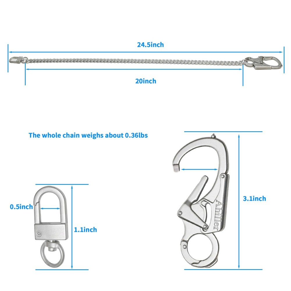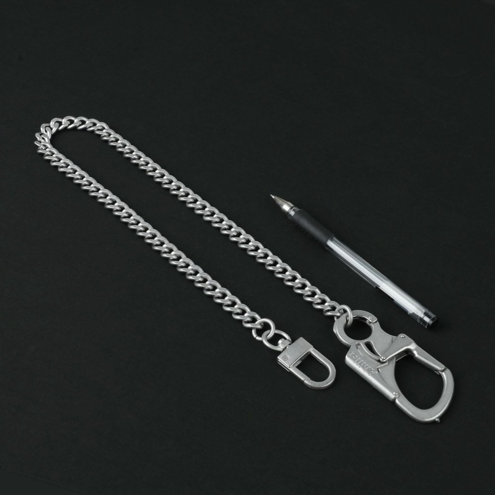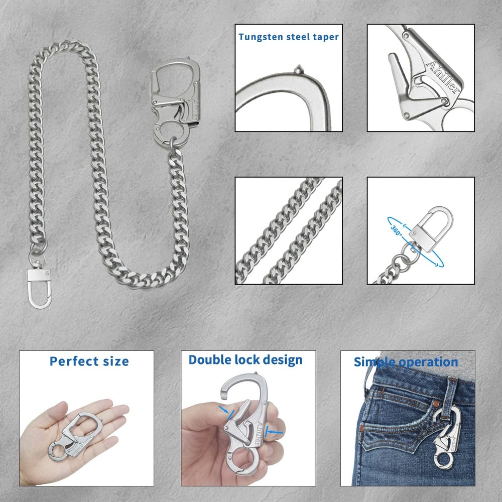 This is a stylish keychain with chain, the keychain on the taper nails made of super hard tungsten steel, durable, widely suitable for different outdoor activities and daily use CAR WINDOW BREAKER: The carabiner can be removed from the wallet chain and used separately. The spikes on the carabiner are made of tungsten steel spikes, which are hard and strong enough to easily break a one-story car window. This feature allows you to use it to escape in dangerous situations. DOUBLE LOCK DESIGN: The carabiner wallet chain has a double lock design mechanism, the lock can only be unlocked when both sides of the switch are pressed at the same time, which can effectively prevent the loss of your belongings. We own the exclusive design patent of this wallet chain. MATERIALS: The chain is made of high-gloss polished and high-quality plated steel chain, assembled with alloy clasp, the whole chain is about 24.5in long, weighing about 5.8oz(165g). MULTIPURPOSE: It can also be used as a key chain, and also a common men's jeans chain, pocket chain, belt chain, heavy duty biker wallet chain in life. GUARANTEED SERVICE:Our primary goal is to satisfy our customers. We offer 12 months of after-sales service and 30 days of no-reason returns. If you have a problem while using, we will solve the problem for you within 24 hours.