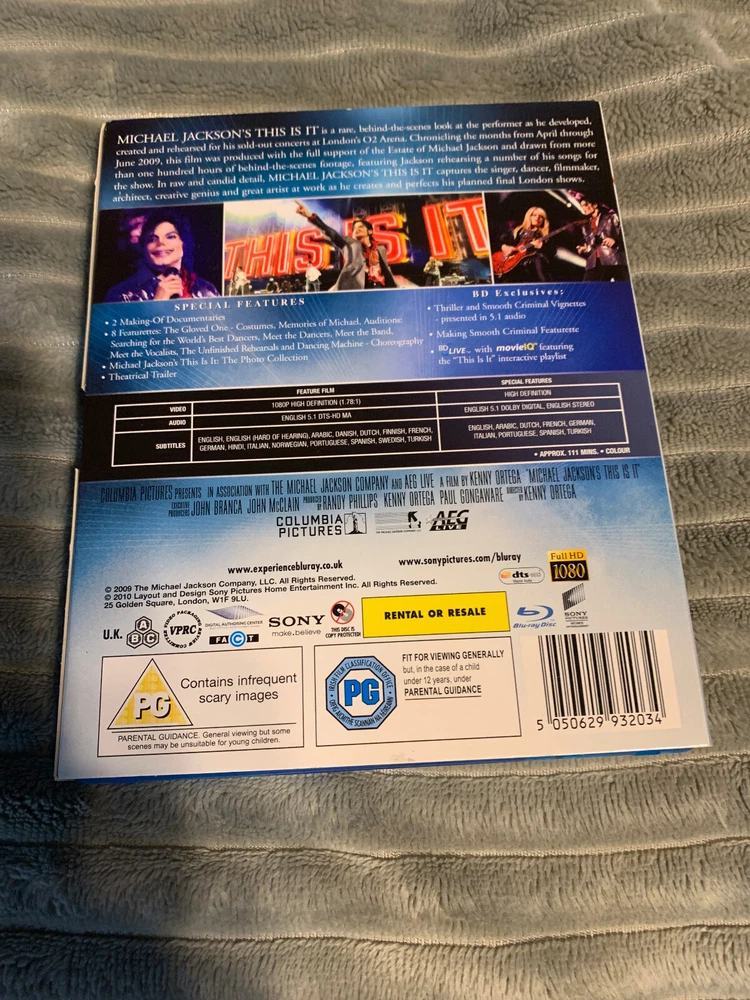 Format:Blu-rayGenre:PopRun Time:111 min.Rating:PGUPC:0043396338814Release Year:2009MPN:Does not applySub-Genre:Music Video (Concert/Performance)Language:EnglishMovie/TV Title:Michael Jackson's this Is Itgtin13:0043396338814Subtitle Language:English, FrenchDirector:Kenny OrtegaProducer:Kenny Ortega, Paul Gongaware, Randy PhillipsStudio:Sony Pictures