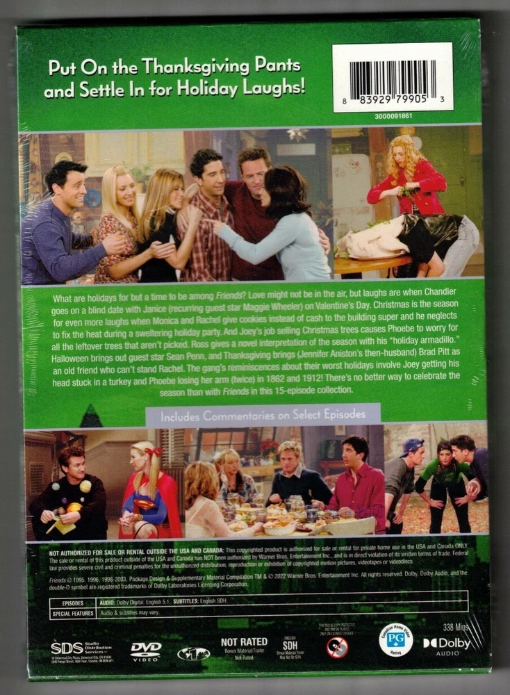 Genre: Television Format: DVD Subtitle Language: English gtin13: 0883929799053 Actor: Jennifer Aniston, Courteney Cox, Lisa Kudrow, Matthew Perry, Matt LeBlanc, David Schwimmer Case Type: Standard DVD Case w/ slipcase Rating: NR UPC: 0883929799053 Franchise: Friends [TV series] Studio: Warner Home Video Language: English Type: TV Series Sub-Genre: Situation Comedy Movie/TV Title: Friends: the One with All the Holidays Collection