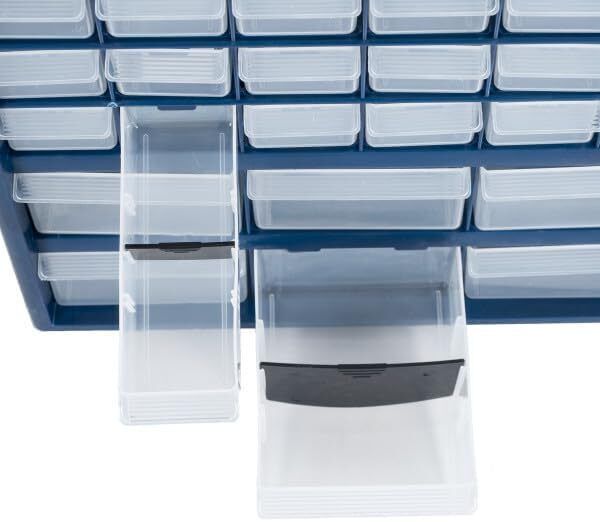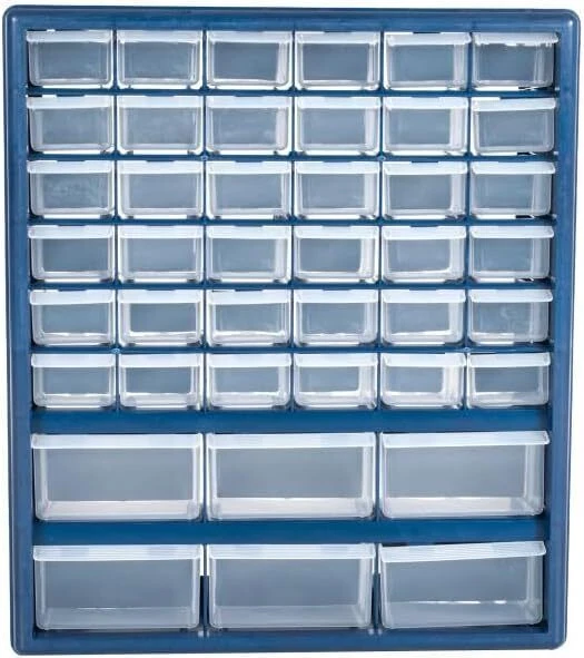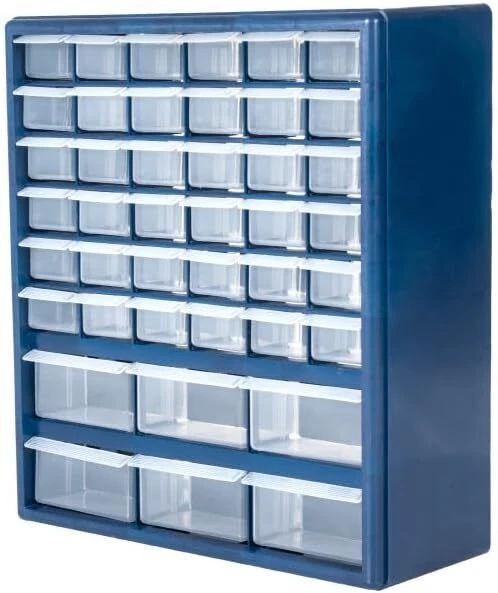 About this item IMPACT RESISTANT MATERIAL – Constructed from durable polypropylene, these storage drawers are made to last, and difficult to damage or break. The strong, see-through clear plastic drawers feature finger grip drawer pulls for easy opening. DESKTOP OR WALL MOUNTABLE – The storage organizer is portable and can be placed on any desk, table, or work surface. The sturdy plastic frame features keyholes on the back for convenient wall mounting in a closet, in a classroom, workshop, or shed. MULTI-PURPOSE – With 42 bins (6 large, 36 small), this cabinet is ideal for storing and organizing everything from fishing tackle, small business supplies, hardware like nuts, screws, and bolts, to crafting materials, beads, makeup, or jewelry. VERSATILE – These organizers are perfect for any area of the house! Get one for your garage, office, kitchen, bathroom, or bedroom. It’s the perfect organizational solution to keep accessories, pieces, or parts nea tly stored and tidy. PRODUCT DETAILS – Material: Polypropylene. Overall Dimensions: (H)17” x (W) 14.5” x (D) 5.25”; Large Drawer Dimensions: (D)5.25” x (W)4.25” x (H) 2.25”; Small Drawer Dimensions: (D)5.25” x (W)2.25” x (H)2.25”. On Feb 20, 2025 at 04:53:44 PST, seller added the following information: