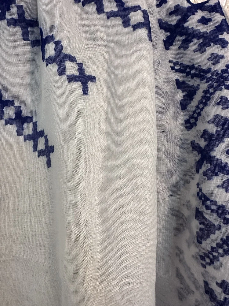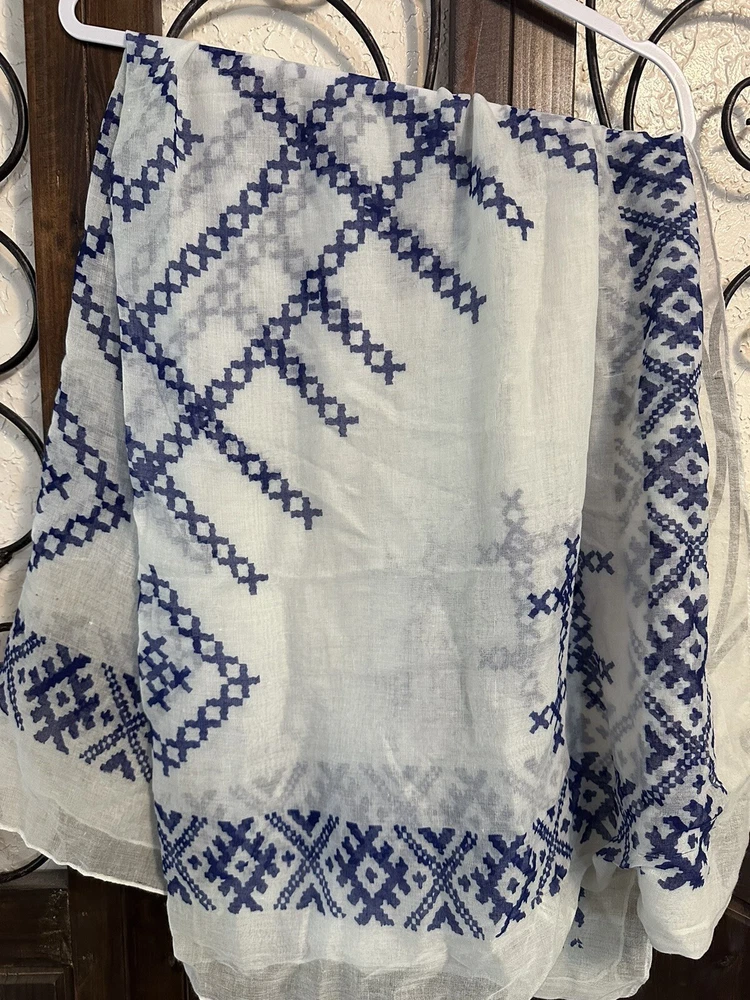 This beautiful navy and white scarf is a must-have accessory for any fashion-forward woman. The intricate embroidery print featuring an argyle/diamond pattern adds a touch of bohemian style to any outfit. Made of high-quality cotton and polyester fabric, this scarf is both comfortable and durable. The multifunctional design allows for versatile styling options, making it perfect for any occasion. Whether worn as a cowl/snood or scarf, this scarf is sure to add a pop of color and personality to any outfit.