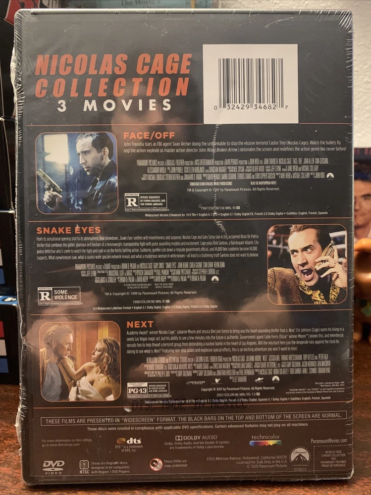 Nearly nine hours of Nicolas Cage! Prisoners of the Ghostland Languishing in the lockup of the garish Samurai Town, career criminal Hero (Nicolas Cage) has a shot at a pardon from The Governor (Bill Mosely) if he can invade neighboring, nuked-out Ghostland and rescue precious, abducted sex worker Bernice (Sofia Boutella). To make sure he stays on mission, our protagonist is fitted out with an explosives-laden suit that'll blow if he deviates. Expectedly out-there English language bow for director Sion Sono co-stars Nick Cassavetes, Tak Sakaguchi. 100 min. Widescreen; Soundtrack: English. Willy's Wonderland With his car broken down in the Nevada desert, a quiet drifter (Nicolas Cage) didn't have any options for cash past an after-hours janitorial job at a condemned family entertainment center. Unfortunately for him and a gaggle of trespassing teens, the facility's eight animatronic mascots came to murderous life-and it doesn't look like they'll win enough tickets to see the morning. Outrageous horror-comedy actioner also stars Emily Tosta, Beth Grant, Ric Reitz, Grant Cramer. 82 min. Widescreen; Soundtrack: English. Face/Off At his best, director John Woo turns action movies into ballets of blood and bullets grounded in character drama. Face/Off marks Woo's first American film to reach the pitched level of his best Hong Kong work (Hard-Boiled). He takes a patently absurd premise--hero and villain exchange identities by literally swapping faces in science-fiction plastic surgery--and creates a double-barreled revenge film driven by the split psyches of its newly redefined characters. FBI agent Sean Archer (John Travolta) must play the villain to move through the underworld while psychotic terrorist Castor Troy (Nicolas Cage) becomes a perversely paternal family man while using every tool at his disposal to destroy his nemesis. Travolta vamps Cage's tics and flamboyant excess with the grace of a dancer after his transformation from cop to criminal, while Cage plays the sullen, bottled-up agent excruciatingly trapped behind the face of the man who killed his son. His attempts to live up to the terrorist's reputation become cathartic explosions of violence that both thrill and terrify him. This is merely icing on the cake for action fans, the dramatic backbone for some of the most visceral action thrills ever. Woo fills the screen with one show-stopping set piece after another, bringing a poetic grace to the action freakout with sweeping camerawork and sophisticated editing. This marriage of melodrama and mayhem ups the ante from cops-and-robbers clichés to a conflict of near-mythic levels. Snake Eyes Set in Atlantic City, an assassination attempt thrusts a detective (Nicolas Cage) into a murder case with 14,000 potential suspects and a deadly conspiracy where nothing is what it appears to be. (English), Set in Atlantic City, an assassination attempt thrusts a detective (Nicolas Cage) into a murder case with 14,000 potential suspects and a deadly conspiracy where nothing is what it appears to be. Next Las Vegas showroom magician Cris Johnson has a secret which is a gift and a curse which torments him: he can see a few minutes into the future. Sick of the examinations he underwent as a child and the interest of the government and medical establishment in his power, he lies low under an assumed name in Vegas, performing cheap tricks and living off small-time gambling 'winnings.' But when a terrorist group threatens to detonate a nuclear device in Los Angeles, government agent Callie Ferris must use all her wiles to capture Cris and convince him to help her stop the cataclysm.
