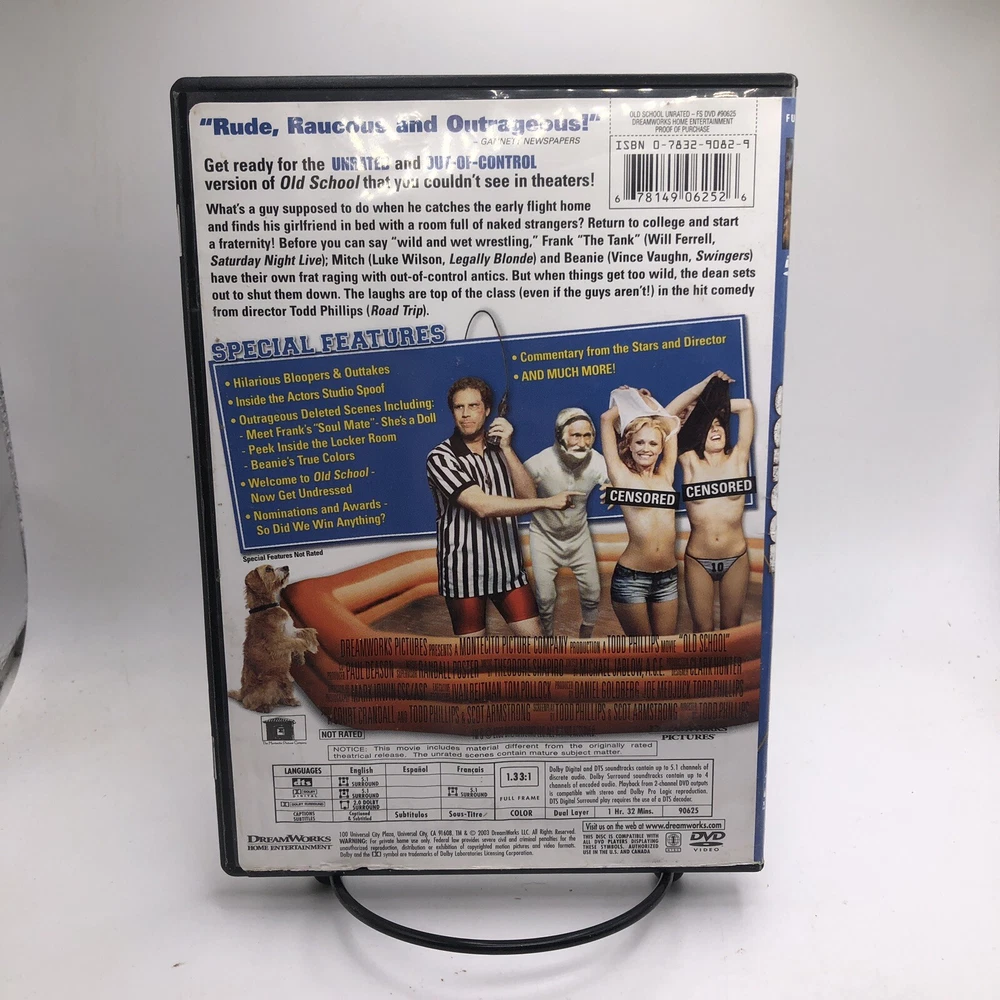 Type: Movie gtin13: 0678149062526 Case Type: Tall/DVD Case Release Year: 2003 UPC: 0678149062526 Seller Notes: “Please see photos. All USED Movies will have some minor scratches and blemishes on cases.” Director: Todd Phillips Edition: Full Frame; Unrated Version Country/Region of Manufacture: United States Movie/TV Title: Old School Format: DVD Region Code: DVD: 1 (US, Canada...) Language: English Actor: Vince Vaughn, Luke Wilson, Will Ferrell Genre: Comedy
