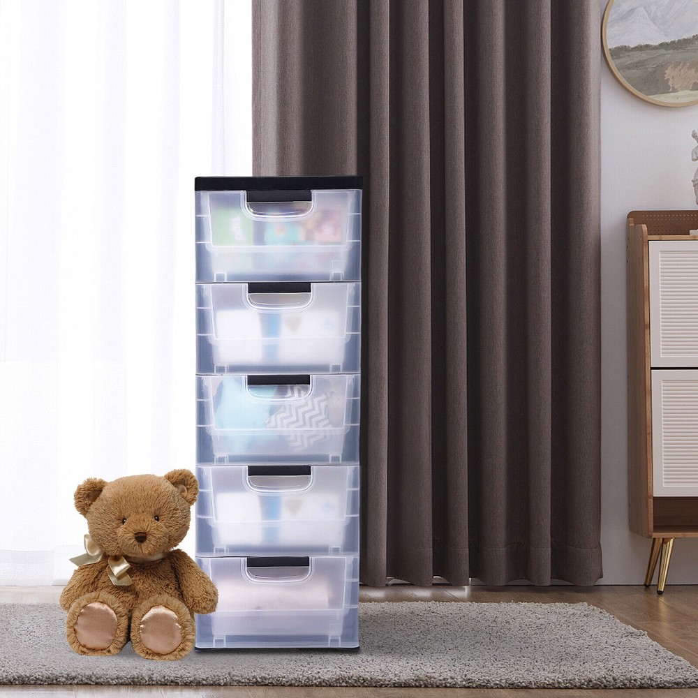 Description Beautiful living starts with organized storage. This storage cabinet with 5 drawers has more space at your disposal. It features a drawer design that can be pulled out smoothly. The transparent color is designed to make it easier for you to remember and find, giving you a better storage experience. Material: PP Color: Transparent Net Weight: 4.1kg/9.04lbs Product Size: 30*40*84cm/11.81*15.75*33.07in Each Layer Load-bearing Capacity: 7-10kg/15.43-22.05lbs Smooth Wheels: The four wheels at the bottom are made of high-qualityPP, so they are smooth and delicate. The smooth wheels run with little noise, providing you with a quiet experience. Snap: The bottom of each drawer is designed with snaps to prevent the drawer from slipping when you pull it, which is very thoughtful. PP Plastic Storage Cabinet 5 Drawers Stackable Clothes Storage Box Organizer HOT Welcome~ De scription This storage cabinet with 5 drawers has more space at your disposal. It features a drawer design that can be pulled out smoothly. The transparent color is designed to make it easier for you to remember and find, giving you a better storage experience. Key Features Compartmentalized Design : You can keep clothes, towels and other items in separate dedicated drawers to reduce cross-contamination. The transparent color partition design is more convenient and easier to find. Easy to Use : The storage cabinet with 5 drawers features a stacking design that allows you to combine and disassemble them as you need. Therefore, it is more convenient and applicable to a wider range than the one-piece type. Rounded Corners : It has rounded edges, which can effectively prevent you from accidentally touching and hurting yourself. Snap : The bottom of each drawer is designed with snaps to prevent the drawer from slipping when you pull it, which is very thoughtful. Drawer Handle : Each drawer is designed with a recessed handle for easy access to items. The rounded handle protects hands from scratches and is more aesthetically pleasing. Excellent Load-bearing Capacity : The thickened material ensures its excellent load-bearing capacity, so each drawer can carry 15.43-22.05lbs of weight. Therefore, you can store items with confidence. Flexible Movement : The bottom of the 5-drawer chest is equipped with four wheels , so you can easily move it from the living room to the bedroom. Application It is suitable for storing clothes, towels, toys and some other small items. Specification Material: PP Style: Modern Number of Layers: 5 Color: Transparent Each Layer Load-bearing Capacity: 7-10kg/15.43-22.05lbs Package Size: 41.5*39*33cm/16.34*15.35*13in Product Size: 30*40*84cm/11.81*15.75*33.07in Gross Weight: 4.7kg/10.36lbs Net Weight: 4.1kg/9.04lbs Package Included 1* Storage Cabinet 5 * Drawers Details Thicker Top Plate : It has a thicker top plate, which gives it a stronger load-bearing capacity. Therefore, you can put cups, small potted plants and other miscellaneous things on the top plate. Smooth Wheels : The four wheels at the bottom are made of high-quality PP, so they are smooth and delicate. The smooth wheels run with little noise, providing you with a quiet experience. Drawer Type : It is designed with drawer type, which is smooth to pull and more convenient to acce ss. Large Capacity : It consists of five drawers and its size reaches 11.81*15.75*33.07in . It can meet almost all your personal belongings storage needs. Space-saving : The storage cabinet with 5 drawers fit nicely into the corners of your walls and closets, sliding effortlessly into seemingly useless tight spaces next to cabinets or refrigerators. Selected Material : It is made of high-quality PP material, so it is odorless and safe to use even for babies or sensitive people. Its excellent impact resistance makes this product sturdy and durable. Elegant Appearance : Fluid lines, smooth surface and transparent color create this elegant storage cabinet with 5 drawers. It will add an elegant, gorgeous touch to your home or office and is ideal for modern-style furniture. Easy to Clean : It is made of stain-resistant PP material. When it has stains on its surface, you only need to ri nse it with water and then wipe it with a soft cloth to make it look brand new. Notes Please allow the slight color difference caused by the shooting light and 1-3cm error due to manual measurement, and make sure you do not mind before you order. Payment Delivery details Terms of sales About us Contact us Payment We accept ebay payment 。 Fees such as import duties, taxes are not included in the item price or shipping costs. These charges are the buyer's responsibility. Delivery details Shipping: 2-9 working days to: USA Terms of sales We maintain high standards of excellence and strive for hundred percent customer satisfaction. Feedback is very important to us. We hope that you contact us immediately before you give neutral or negative feedback, so that we can address your concerns. It is impossible to address issues if we do not know about them! About us Your satis faction is our ultimate goal. We work hard to earn your trust and future business. Our certified technicians have tested each item before shipping. The unit comes with 1 year limited warranty on all manufacturing defects. a) If you receive a defective item, you may return it or ask for a discount. Please contact us within 14 days after you receive the package. b) What you returned must be intact and in its original packaging as re? u. Customer is responsible for shipping costs of the returned item. c) We will cover the cost of shipping back t with the shipping rate indicated in the registration page. We will send you a new unit or refund the full payment you paid. Thank you. Contact us Business Hour Business Hour: Monday To Friday: 8:30 AM to 5:00 PM (Beijing China time) Due to time zones, our reply to your questions may not be immediately. But within above working time, we will reply your email within 24 hours. If it's non-w