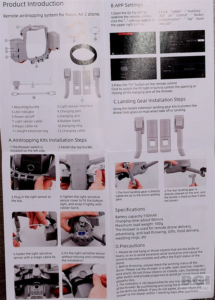 P ayload Release Mechanism For DJI Mavic AIR 2 Drone For Delivery & Rescue Operation Condition Disclosure: The unit is brand new and comes just as pictured watch the following video to learn more about this Payload Release and delivery system. The video is for a Mavic 2 Pro, but the concept is the same https://youtu.be/4XiOXak3u7A Comes Just As Pictured everything you see in photos is included. Please scroll down and look at all high resolution photos that I have provided for you below so you can see exactly all the details of this item. Please note whatever item is not visible in photos is not included unless I state otherwise. If you have any questions you are more than welcome to contact me through eBay messaging and I will be sure to get back to you in 24 hours or less. Thanks IMPORTANT NOTICE TO INTERNATIONAL BUYERS: The shipping and Handling fees do not include any additional Customs Taxes or Duties that you might be paying at your local Customs office or Post Office. These Taxes are usually collected at the time of delivery or pickup and it is buyers responsibility to pay. The amount of these Taxes depends on the tax rate in each country, and on the value of this item. In some counties such as Dubai, there are no Customs Taxes. So please keep this in mind before buying this item. ALL PHOTOS REPRESENT THE SAME ITEM FROM DIFFERENT SIDES AND ANGLES. WHAT YOU DON'T SEE IN THE PICTURES IS NOT INCLUDED. IN SOME CASES I INCLUDE A RULER, A COIN OR OTHER MEASURING OBJECTS TO GIVE YOU A PERSPECTIVE OF THE SIZE OF THE ITEM BUT THEY ARE NOT INCLUDED IN THE SALE. SHIPPING US BUYERS Shipping and handling is FREE to all lower 48 States and that includes insurance to Alaska, Hawaii and Puerto Rico it will be extra. Per eBay and PayPal policy If the total value of your purchase is over $200 signature will be required at the time of delivery. If the total value of your purchase is less than $200 we don't require for a signature at the time of delivery. If you live in a bad neighborhood with a history of packages being stolen from porches etc. and your order is of high value, then please ask as to add signature requirements at the time of delivery. There will be no extra cost to you, as a courtesy we will pay for the signature requirement costs which is about an additional $4. If the total value of your purchase is less than $20 then it will not be feasible for us to cover the signature costs. Thank you INTERNATIONAL BUYERS YOU MUST READ THIS BEFORE B UYING NORMALLY A PACKAGE SHOULD NOT TAKE MORE THAN 15 DAYS TO SHIP INTERNATIONALLY BY USPS (UNITED STATES POSTAL SERVICE) AIR PARCEL TO ANY COUNTRY IN THE WORLD. BUT IN REALITY IT IS NOT THE CASE, SOME PACKAGES THAT I HAVE SHIPPED HAS TAKEN UP TO TWO MONTHS. THIS IS DUE TO MANY REASONS, SOME TIMES IT GETS STUCK IN US CUSTOMS, SOME TIMES IN FOREIGN COUNTRIES CUSTOMS, AND SOME TIMES IT IS LOST OR STOLEN. I DO INSURE THE PACKAGES SO IF IT IS LOST OR STOLEN I CAN CLAIM THE VALUE, BUT I CAN NOT GUARANTEE THE TIME. TO GET THE MONEY BACK FROM THE POST OFFICE IT COULD TAKE MONTHS. IF YOU WANT THE ITEM TO GET THERE ON TIME AND SAFE, YOU MUST USE PRIVATE SHIPPING COMPANIES SUCH AS UPS, FEDEX, DHL, AIRBORNE ETC. THESE COMPANIES CHARGE A LOT OF MONEY MORE THAN YOU CAN IMAGINE ABOUT $60/ POUND TO SOME COUNTRIES, BUT IT WILL BE THERE FOR SURE IN ABOUT A WEEK OR TWO. SO PLEASE TAKE THIS IN CONSIDERATION BEFORE BIDDING. IF I SHIP BY POST OFFICE IT IS THE CHEAPEST BUT, I CAN ONLY GUARANTEE THAT YOU WILL GET YOUR ITEM OR YOUR MONEY BACK, I CAN NOT GUARANTEE HOW LONG WILL IT TAKE TO GET YOUR ITEM OR YOUR MONEY BACK. BECAUSE THAT IS NOT IN MY CONTROL, ONCE I PACKED THE ITEM AND SHIPPED IT THERE IS NOTHING I CAN DO TO MAKE SURE YOU GET IT, EXCEPT INSURING IT WHICH I ALWAYS DO. ALSO KEEP IN MIND THAT IN SOME COUNTRIES YOU HAVE TO PAY ADDITIONAL CUSTOMS FEES AND TAXES ON TOP OF THE SHIPPING AND HANDLING FEES SO PLEASE BE AWARE OF THIS BEFORE BUYING. THANKS Powered by SixBit's eCommerce Solution
