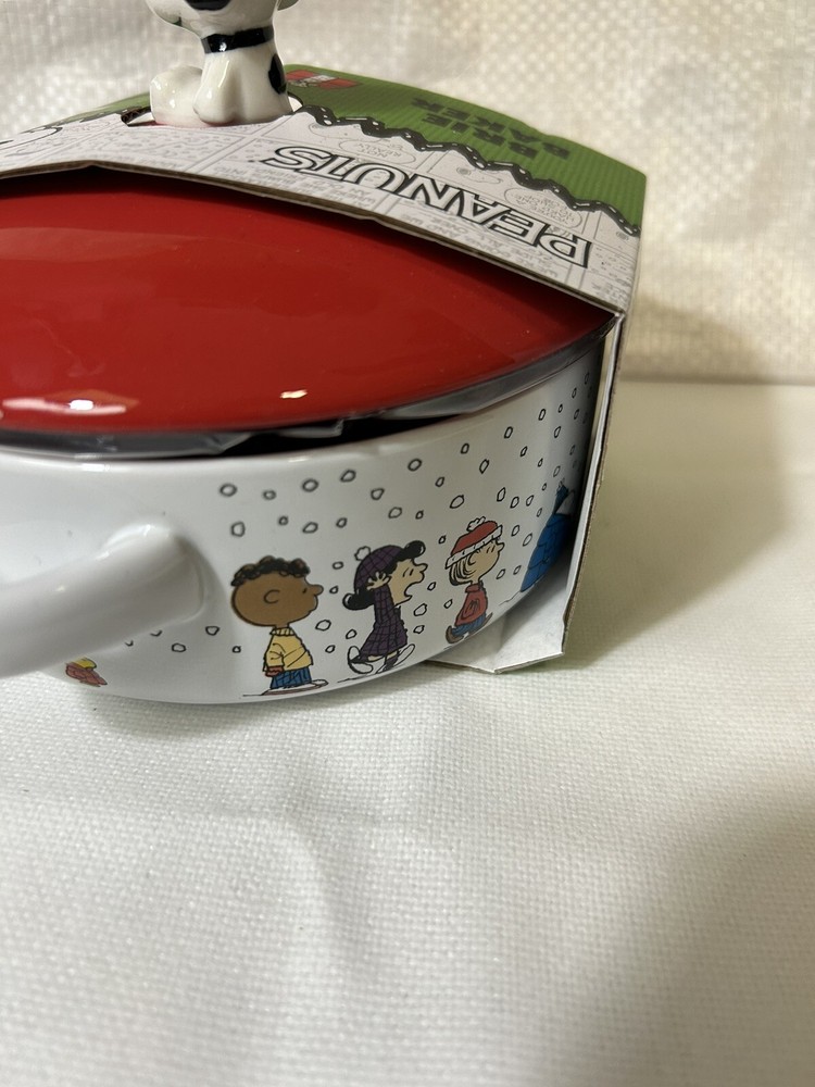This unique Peanuts Charlie Brown & Gang Christmas Brie Baker is sure to delight any fan of the classic cartoon. The ceramic brie baker features a colorful design with Snoopy and the gang, and comes with a wooden spoon for easy serving. It's perfect for collectors or anyone looking for a fun and festive addition to their kitchen. The brie baker is manufactured in China and is part of the Peanuts franchise. It's a great gift for anyone who loves the show or collects animation merchandise. Get ready to show off your love for Snoopy and the gang this holiday season with this charming brie baker.