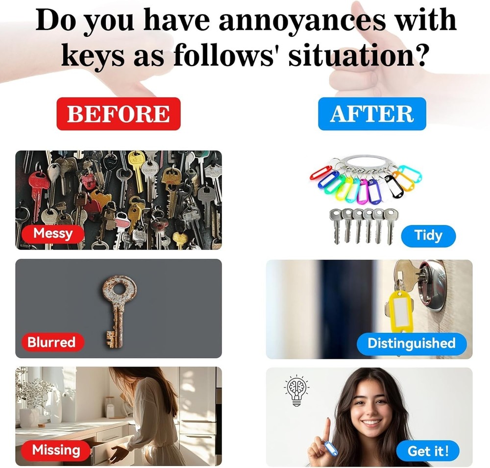 BRAND NEW 【10 Bright Colors】Each package comes with 50 pack key tags in 10 bright colors (including blue, white, rose red, red, orange, black, green, purple, yellow, sky blue), 5 pieces of each color. Various colors are great for identifying different keys for different locks without taking up much room 【Convenient Design】Each key tag contains blank paper for labeling, convenient for you to write markings. And the transparent window design allows you to see the mark at a glance. The split rings make it easy for you to connect them to items. Very lightweight, easy to carry, which will not cause you any additional burden 【Easy to Use】Our plastic keychain label tag is easy to use. We suggest that you remove the keyring first, then remove the label and protective film, mark it and wait for the ink to dry completely to avoid smearing, then install the label and protective film, finally place the keyring back on 【Wide Application】These key id label tags are made of premium plastic material, durable and sturdy, not easily fading. They are great as name tags on keys, lunchboxes, backpacks, luggage, suitcases, USB flash drives, or anything else that needs an ID. Your good helper in organizing messy keys 【Wide Application】These key id label tags are made of premium plastic material, durable and sturdy, not easily fading. They are great as name tags on keys, lunchboxes, backpacks, luggage, suitcases, USB flash drives, or anything else that needs an ID. Your good helper in organizing messy keys THANK YOU