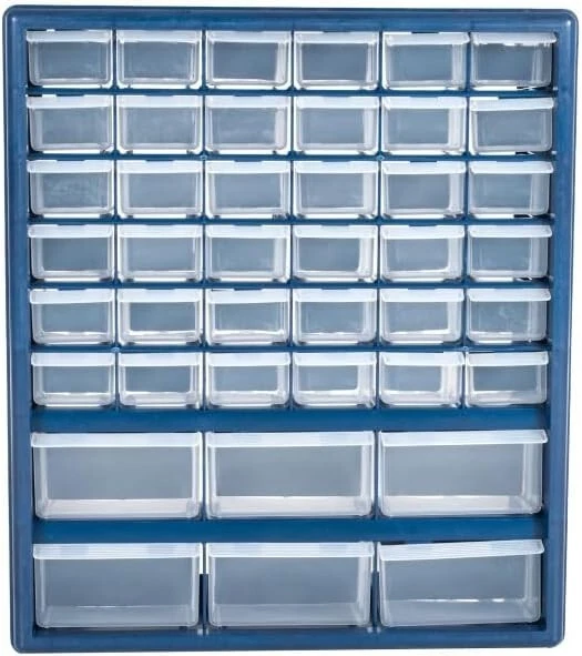 IMPACT RESISTANT MATERIAL – Constructed from durable polypropylene, these storage drawers are made to last, and difficult to damage or break. The strong, see-through clear plastic drawers feature finger grip drawer pulls for easy opening. DESKTOP OR WALL MOUNTABLE – The storage organizer is portable and can be placed on any desk, table, or work surface. The sturdy plastic frame features keyholes on the back for convenient wall mounting in a closet, in a classroom, workshop, or shed. MULTI-PURPOSE – With 42 bins (6 large, 36 small), this cabinet is ideal for storing and organizing everything from fishing tackle, small business supplies, hardware like nuts, screws, and bolts, to crafting materials, beads, makeup, or jewelry. VERSATILE – These organizers are perfect for any area of the house! Get one for your garage, office, kitchen, bathroom, or bedroom. It’s the perfect organizational solution to keep accessories, pieces, or parts neatly stored and tidy. PRODUCT DETAILS – Material: Polypropylene. Overall Dimensions: (H)17” x (W) 14.5” x (D) 5.25”; Large Drawer Dimensions: (D)5.25” x (W)4.25” x (H) 2.25”; Small Drawer Dimensions: (D)5.25” x (W)2.25” x (H)2.25”.