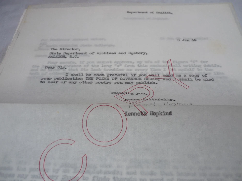 Contact Us Visit Our Store Home About Us Shipping Returns Contact Us View Feedback The Poems of Governor Thomas Burke of North Carolina On Divers Matters including a few Written in Praise of the American War for Independence Against Great Britain Hardback published in 1961 by State Dept of Archives and History at the City of Raleigh. Introduction and notes by Richard Walser, letter enclosed to Professor Kenneth Hopkins from Richard Walser. 69 pages with tanning, boards a little marked. Home About Us Shipping Returns Contact Us View Feedback