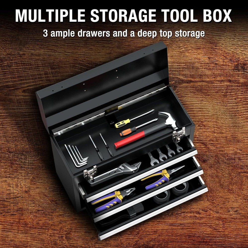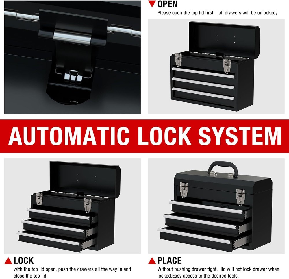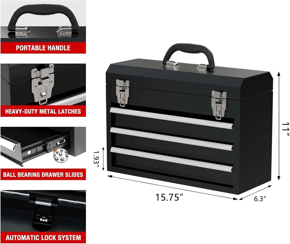 Product Description Portable Metal Tool Box, 3-Drawer Steel Organization Micro Tool Chest for Household, Warehouse, Repair Shop, Black 100% metal đ§°ăMore Relaxedă- Please attention that It's a small box, Our original intention of developing the toolbox is that you will feel more relaxed when you go to work with it. please check the size before you place an order. If you mind, please don't buy it. đ§°ăExtra storageă- The steel tool box consists of two ample drawers and a deep top storage compartment allow for maximum organization and flexibility, the full-extension steel drawer slides, allow access to the entire drawer and easy to open, you can get the tools you need more quickly. Hold up to 88LBS. đ§°ăEasy to Moveă- Portable tool box convenient design features a carrying handle and lightweight construction, comfortable handle allows you carry the box easily even when it's filled, the lock bar keep drawer tight, Automatic locking when the lid is closed, prevent the drawer from slipping out when toolbox carried. đ§°ăsecure Designă- The tool box has 2 steel lock latches, Prevent the top box from opening accidentally to cause the tool to fall. The middle of top with lock bar, when you open the lid to take out the tool, the lid will not suddenly close and crush your hand. About Us We are a reputable seller with many years of experience selling on eBay. Our goal is to provide high-quality products and excellent customer service. Shipping Items will be shipped within 1-3 business days when we received payment. (Orders are not processed on weekends & holidays) Tracking information will be sent once item is shipped. Delivery time depends on destination and other factors Item is shipped to ebay address. Leaving correct address can minimize delay. For international shipping and shipping to Guam, Hawaii and Alaska, Please contact us before placing the order. International buyers please note: Import duties, taxes and charges are not included in the item price or shipping charges. These charges are buyerâs responsibility. We will try our best to reduce the risk of the custom duties. Local pick-up is unavailable at the moment. Contact Us We reply any email messages within 1 business / working days(off-duty at weekend). If you do not get a response from us, then please check your junk or spam mailbox. Our Business hours: Mon-Fri 9:00-18:00, UTC/GMT +8 hours. Please contact us either by clicking "contact seller" in the "purchase history" section or simply click "ask a question" at the bottom of this page. If you are unsatisfied with our item or service, please contact us before leaving any feedback. We are committed to resolve all issues in a friendly and satisfactory manner.