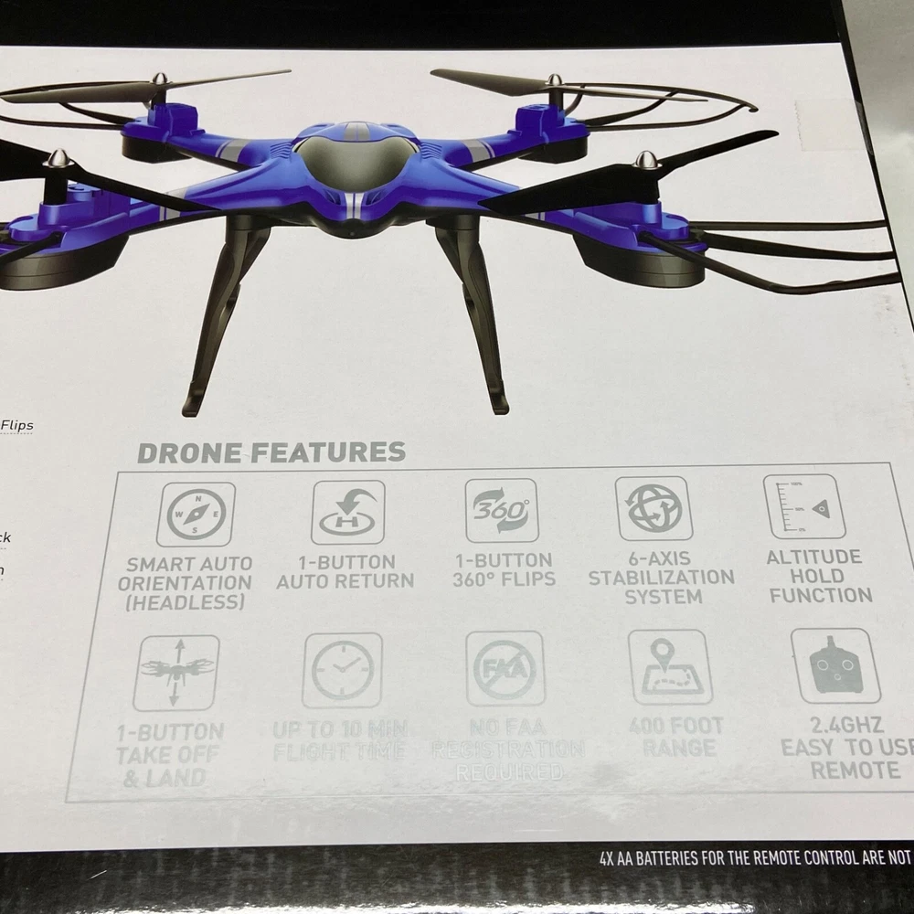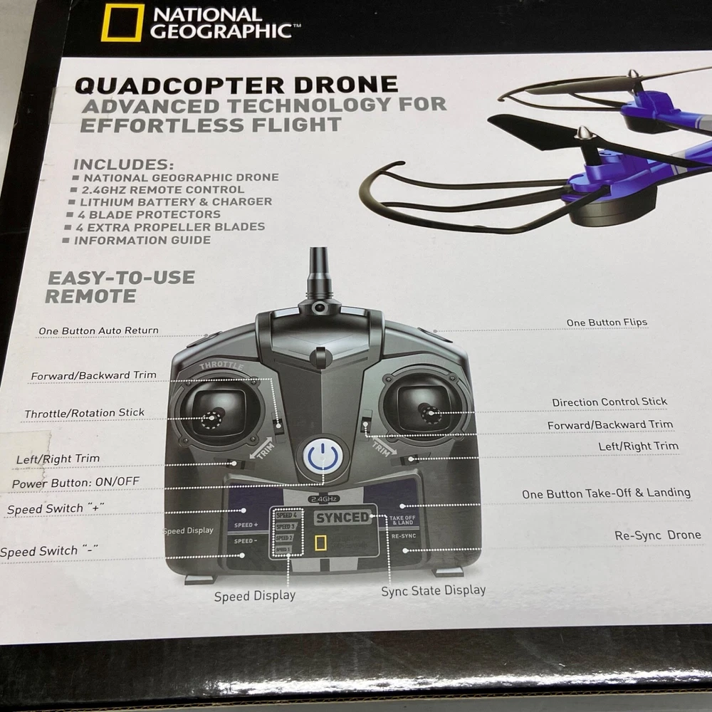 (I opened this box to make sure the drone and all of it’s accessories were inside and in Brand New condition.) Experience the excitement of flying with this National Geographic Quadcopter Drone. With a maximum control range of 400ft., this blue plastic toy is perfect for anyone aged 14 years & up. The drone is equipped with headless mode, 1-button 360 flip mode, 1-button return to pilot mode, and does not require any assembly, making it easy to use right out of the box. This quadcopter drone is perfect for anyone interested in advanced technology and radio control toys. It is manufactured in China and runs on batteries.The National Geographic brand is known for its quality and dedication to exploration, making this drone a great addition to any collection. Same Day Shipping. Thank you for shopping TKO Specialties