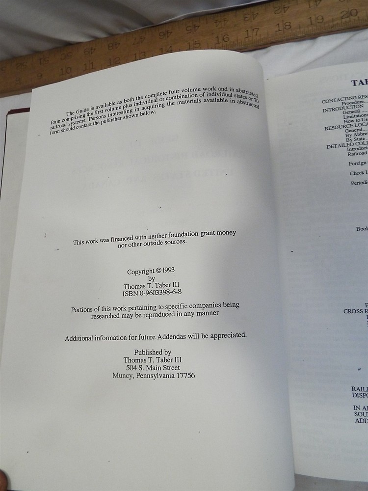Item Description A four volume set titled Guide to Railroad Historical Resources by Thomas Taber. Copyright is 1993. These are in overall good or better condition with mild cover wear. They look to be largely unread. Book Shelf C/021225 - FO We sell mostly USED and UNIQUE items. Expect minor evidence of use or imperfections, dings etc. from age. We take many photos of our items to assist with the description. Please use the photos to help judge content and condition. BUY WITH CONFIDENCE : We have sold over 25,000 antiques on-line since 1997 with over 15,000 positive customer feedback. We have been giving quality service to the on-line collector community for over 19 years. Our selling history speaks for itself so that you can buy with confidence. RETURNS : Accepted, full purchase price refunded upon return. Buyer to pay return shipping. Please inspect your item, and notify us of a return within 3 days of receiving it. SHIPPING : 99% of items shipped within three business days. Powered by SixBit's eCommerce Solution