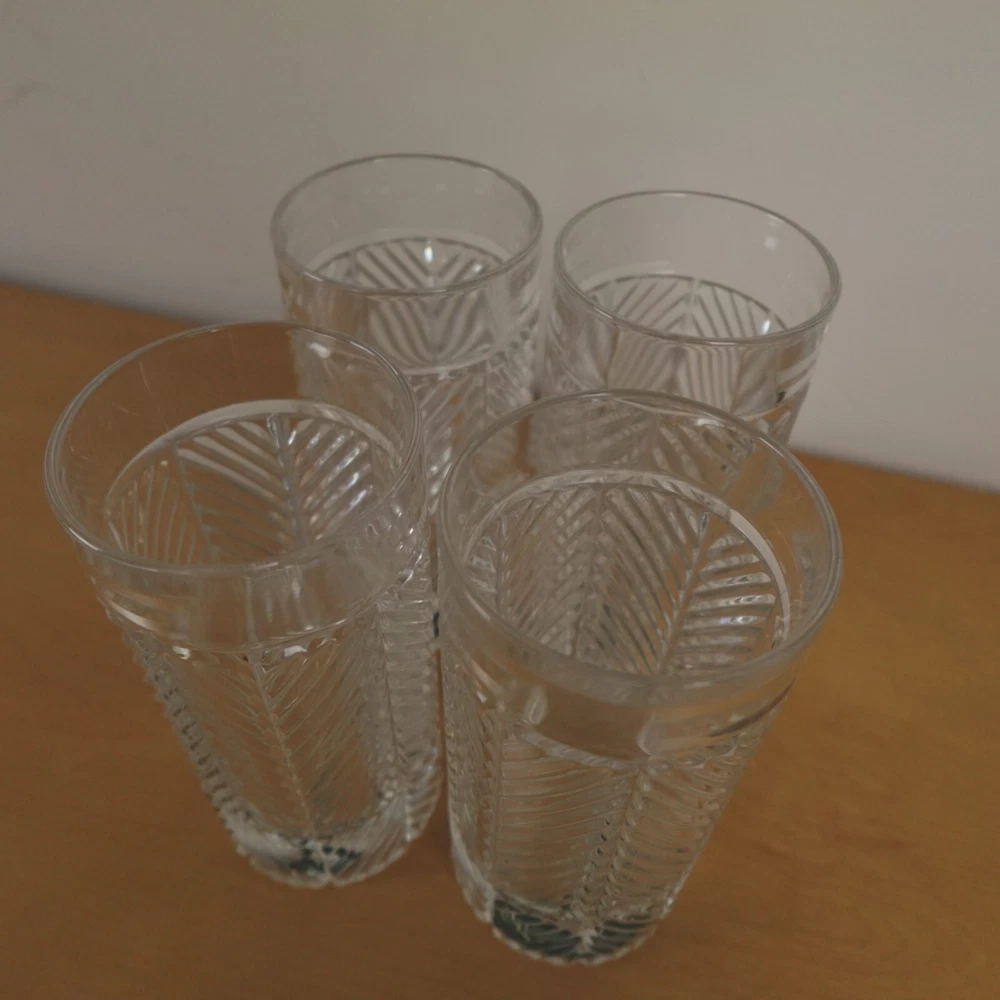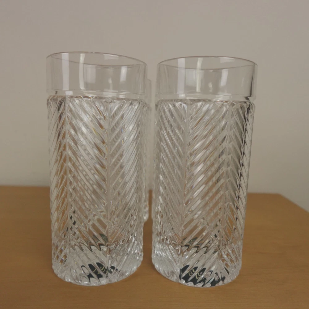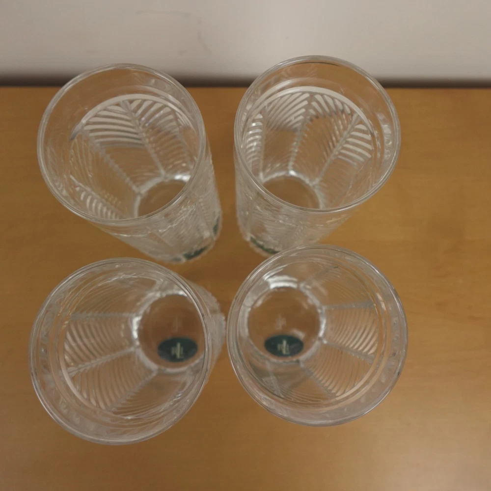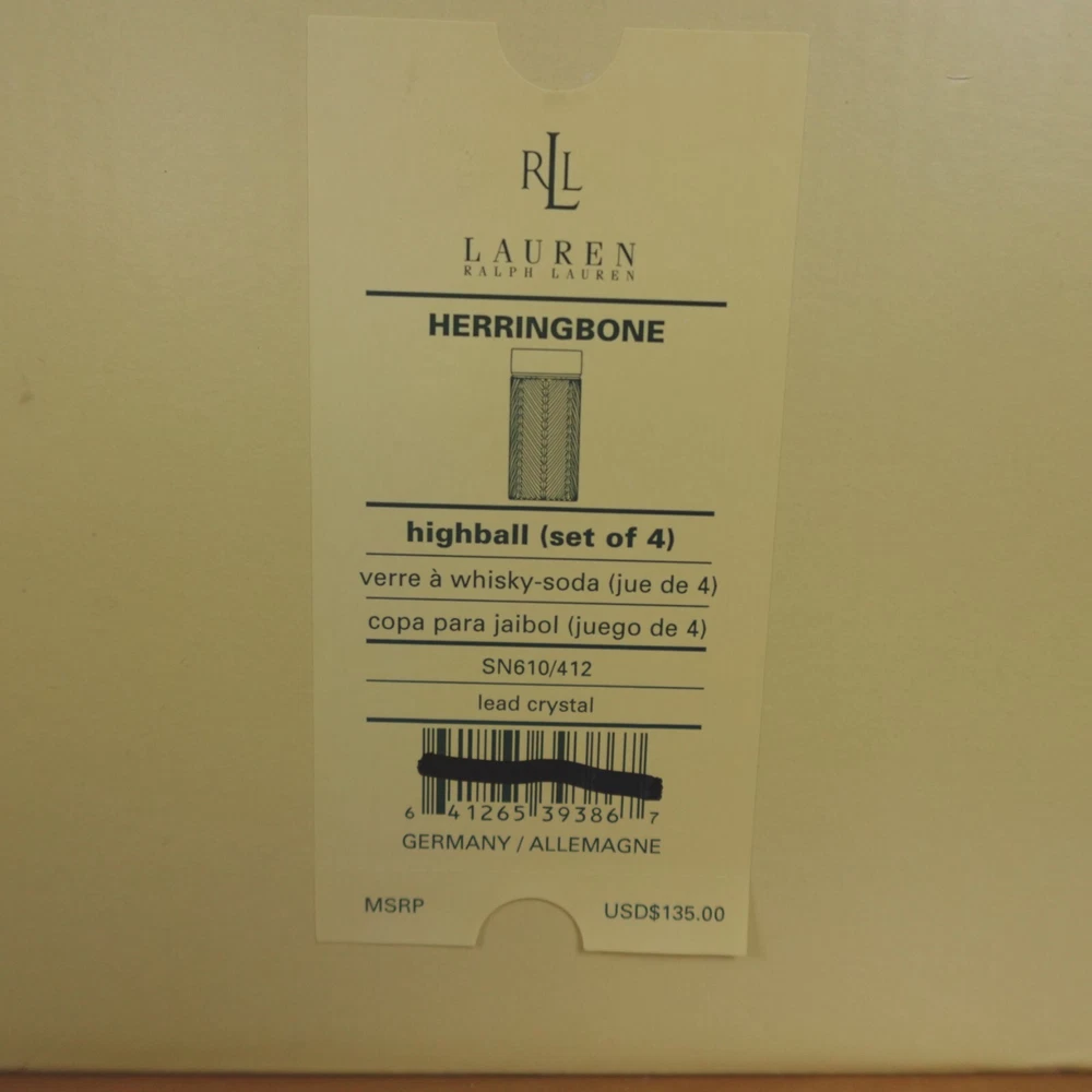 Ralph Lauren Herringbone Glasses Highball Lead Crystal Set of 4 Made in Germany New In Original Box Etched Signed. Never used, discontinued design. Glasses still feature the original sticker on the bottom as pictured. No chips, blemishes, or signs of wear noted, please review all photos. See photos for measurements. If we missed something, don't worry, we offer free returns in original condition. Just indicate, "just didn't like it," for any reason, and we'll pay for the return. Will be professionally packaged for safe delivery. I have 4 additional sets of 4 (16 glasses total), please see my other listings if interested. Thanks for visiting!