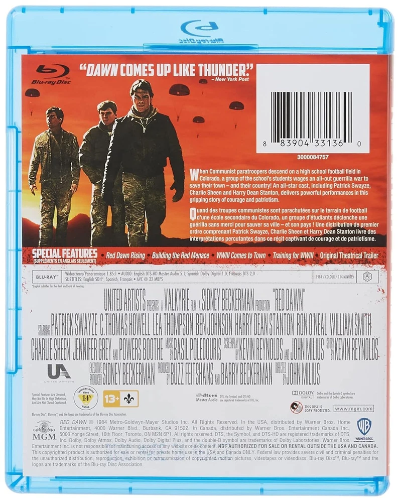 Further Details Title: Red Dawn (1984) Condition: New Description: It is the dawn of World War III. In mid-western America, a group of teenagers bands together to defend their town, and their country, from invading Soviet forces. Actor: Patrick Swayze, C. Thomas Howell Format: Blu-ray Director: John Milius EAN: 0883904331360 Rating: MPAA PG-13 No Of Discs: 1 Run Time: 1 hour and 54 minutes Region Code: Blu-ray: A (Americas, Southeast Asia...) Language: English, French Subtitle Language: English, Spanish, French Missing Information? Please contact us if any details are missing and where possible we will add the information to our listing.