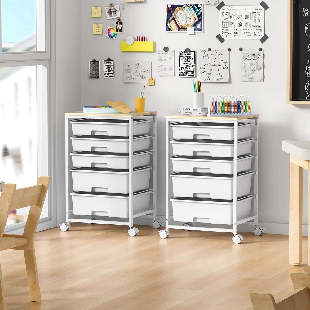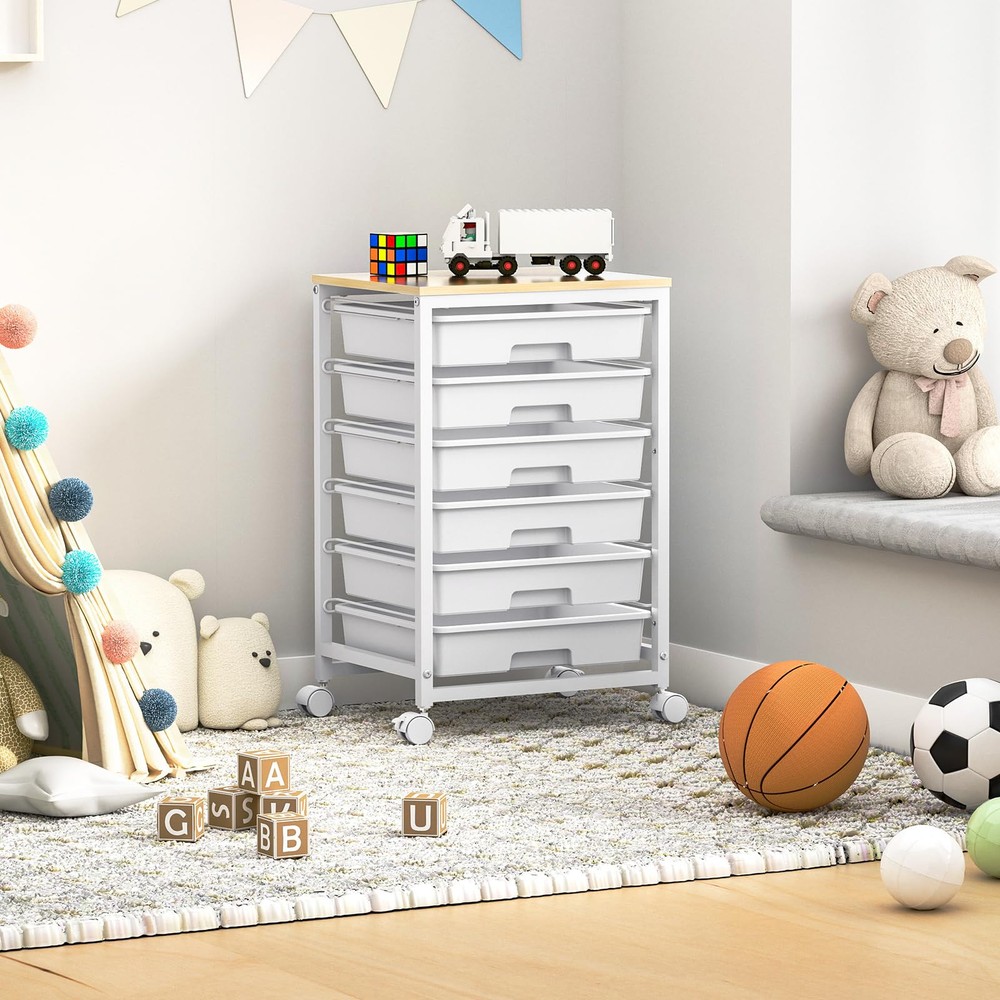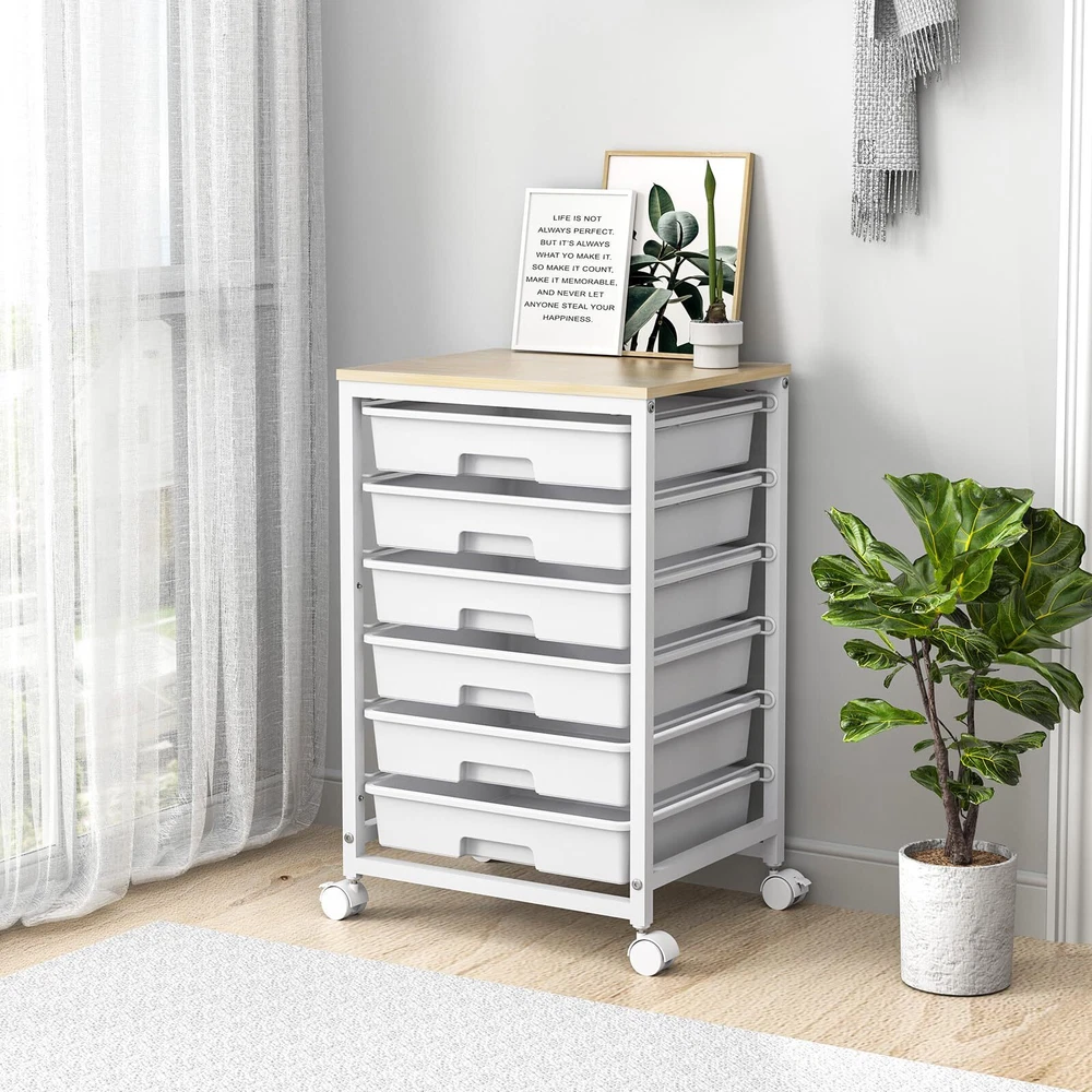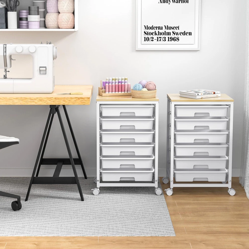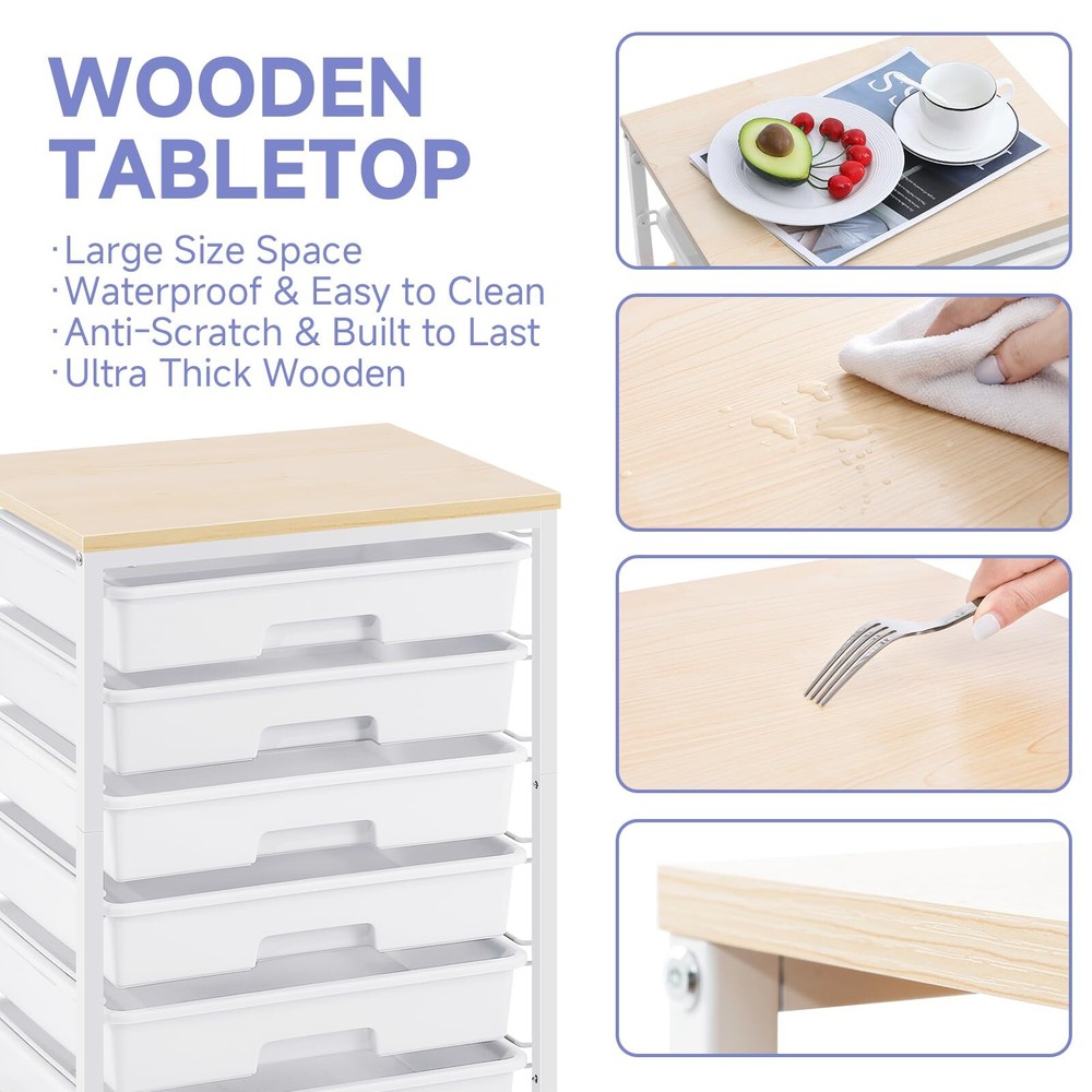 6 DRAWERS FOR LARGE STORAGE CAPACITY: Rolling cart with drawers includes 6 drawers which provide ample space for you to stuff by different categories. Moreover, you can organize these items by color, stereotype, and size to keep them tidy and clean. Slide-out drawer design, with smooth slide track and ergonomic handles, easy to open or close. WOODEN TABLETOP & THICK DRAWERS & METAL FRAME: The utility cart with drawers boasts a sturdy and durable -coated steel frame with water and rust resistance ensures a sturdy construction and built to last. Additionally, the slide-out drawers are made of durable PP material, which also boasts great durability. Holds 33 pounds on tits op plate and 11 pounds per drawer. This 6 drawers rolling storage cart will serve you for a long time. AMPLE SPACE FOR STORAGE & CLASSIFICATION: The overall size of this rolling storage cart with drawers is 15.55"D x 12.60"W x 24.49"H. Wooden tabletable top allows you to put plants, DIY cutting machine,printer and other decorations. By expanding the storage space vertically, smart solution of making full use of limited space. There are different color drawers for to and classifying your stuff. FLEXIBILITY MOBILITY & LOCKABLE WHEELS: Storage cart with drawers with four universal wheels can swivel 360 degree and help you move it easily. Locking wheels provide maneuverability and stability when needed. Smooth wheels, scratches and noise during movement can be effectively avoided. FIT YOUR DIFFERENT STORAGE NEEDS & EASILY ASSEMBLED: Whether you are a housewife,an office worker,a student or a craftsman,this practical versatile cart will be very helpful to you. Perfect for living room,bedroom, office,sewing room,craft room,classrooms,dorm,art studio or homework station. More drawers and colors great to storage tools,sewing supplies,embellishments,punches,stamps,paper,scrapbooking,school supplies,toys,stationery,office supplies,art and craft materials and beauty products.