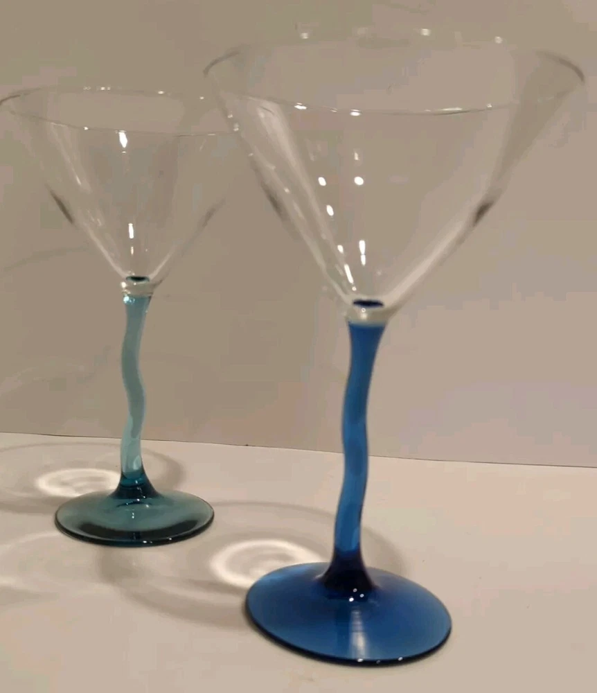 These whimsical stemmed martini glasses will add a special flair to your next party. The curved stems (1 light blue and 1 dark blue) have a unique look that will stand out. They stand just under 8 inches tall and are free of chips and scratches.