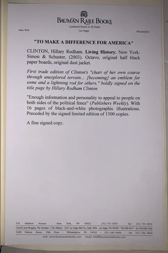 Living History by Hillary Rodham Clinton New York: Simon & Schuster 2003 First Trade Edition, First Printing Signed by Hillary Clinton on the title page. Octavo, xi, 562 pages, publisher's original pictorial dust jacket. Publisher's original gilt lettered, blind stamped black cloth over black boards. Illustrated with sections of black and white photographs. Dust jacket now in protective mylar sleeve. Laid in, is a catalogue description from a prior dealer [Bauman Rare Books]. In fine condition. If you have any questions, feel free to ask, and don't forget to check out my other listings.