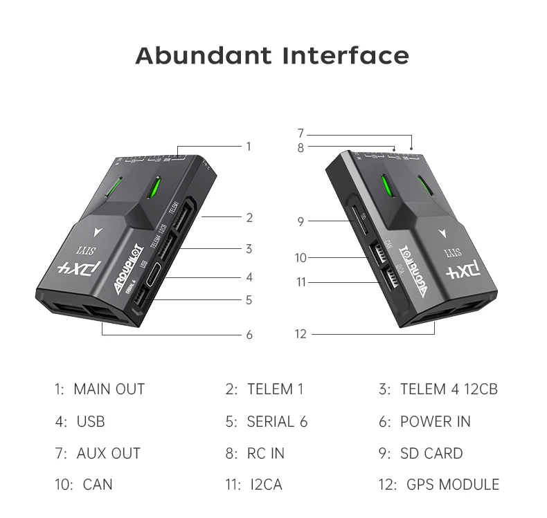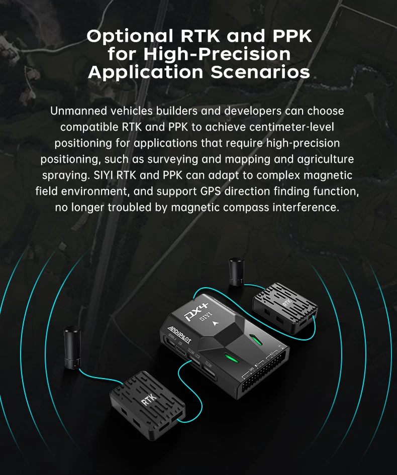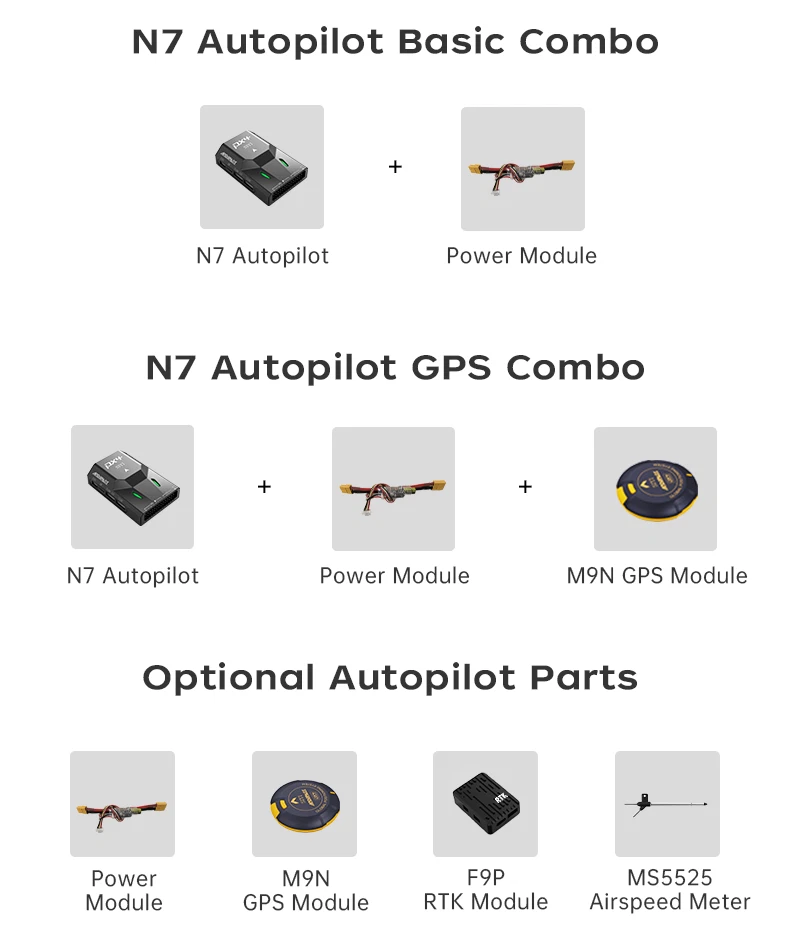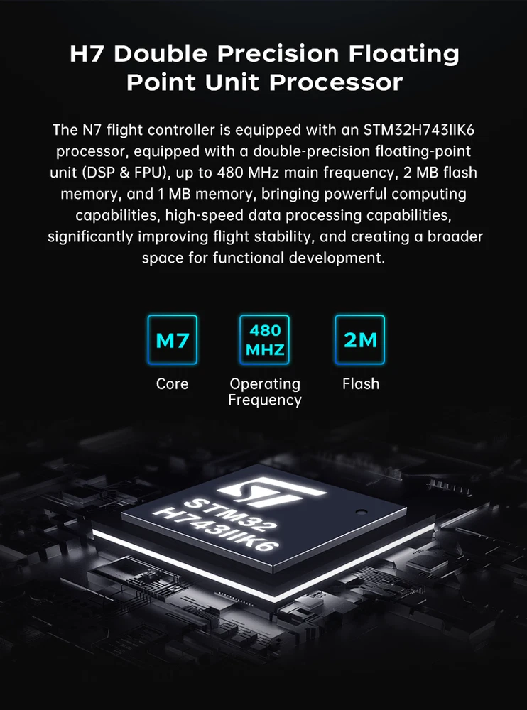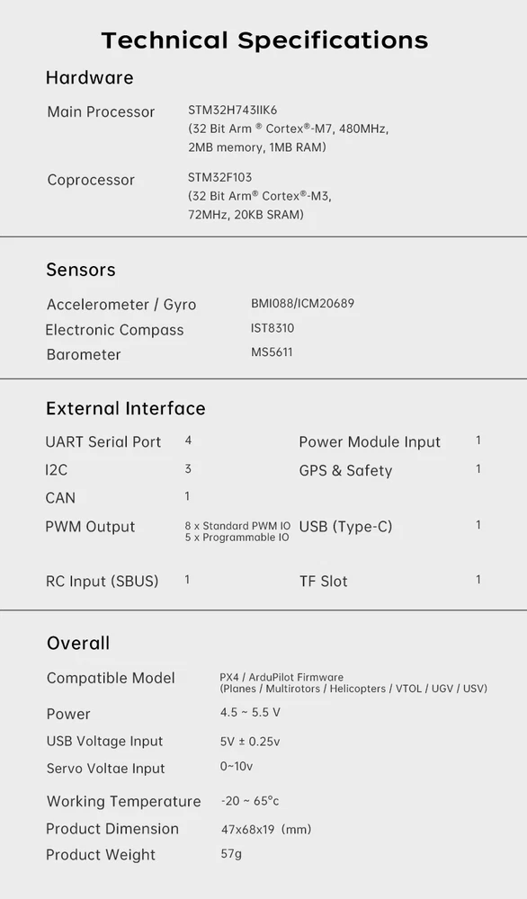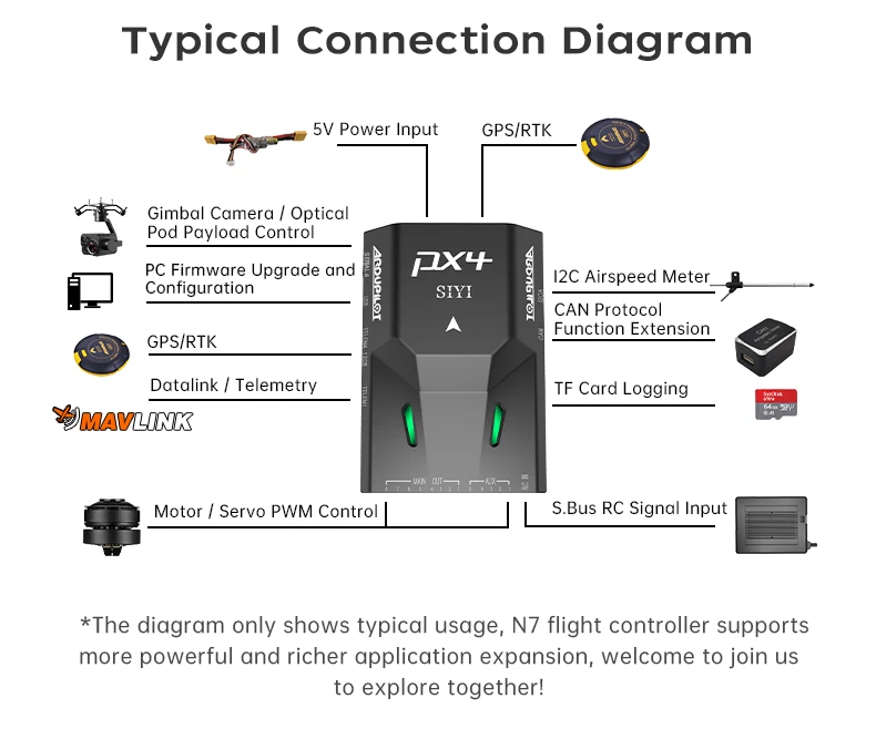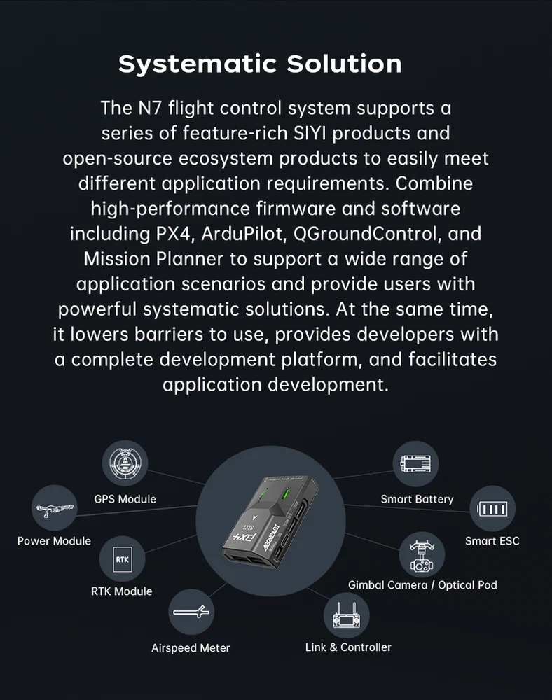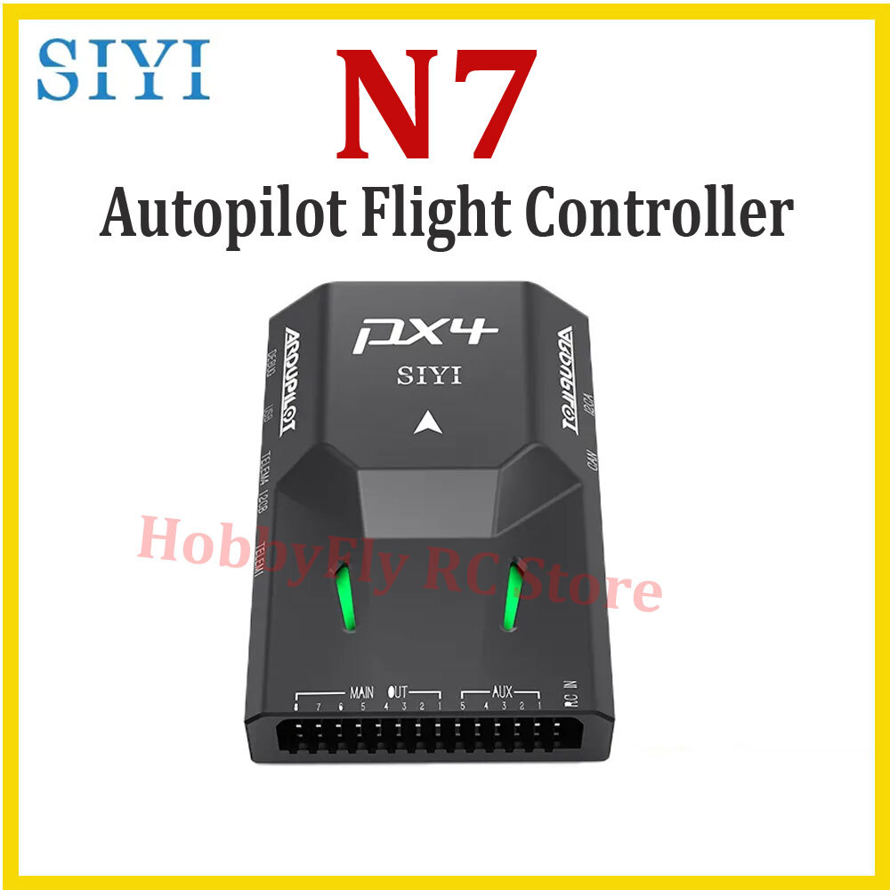 SIYI N7 Autopilot Flight Controller The SIYI N7 flight controller is equipped with the H7 double-precision floating-point unit processor. It adoptsbuilt-in dual IMU redundancy and internal shock absorption structure design, which endows the aircraft with highreliability. The N7 flight controller is compatible with both Ardupilot and PX4 open-source ecosystem to achieve adbundant application scenarios and provide stable andcomprehensive systematic solutions for enthusiasts andindustry application explorers of drones, unmanned vehicles and ships, smart robots. Specifications: Hardware Main Processor: STM32H743IIK6 (32 Bit Arm Cortex-M7, 480 MHz, 2 MB memory, 1 MB RAM) Coprocessor: STM32F103 (32 Bit Arm Cortex-M3, 72 MHz, 20 KB SRAM) Sensors Accelerometer / Gyro: BMI088 / ICM20689 Electronic Compass: IST8310 Barometer: MS5611 External Interface UART Serial Port: 4 I2C: 3 CAN: 1 PWM Output: - 8 x Standard PWM IO - 5 x Programmable IO RC Input (SBus): 1 Power Module Input: 1 GPS & Safety: 1 USB (Type-C): 1 TF Slot: 1 Overall Compatible Model: PX4 / Ardupilot Firmware (Planes / Multirotors / Helicopters / VTOL / UGV / USV) Power Module Voltage Input: 4.5 ~ 5.5 V USB Voltage Input: 5 V ( ± 0.25 V) Servo Voltage: 0 ~ 10 V Working Temperature: -20 ~ 65 ℃ Product Dimension: 47 x 68 x 19 mm Product Weight: 57g