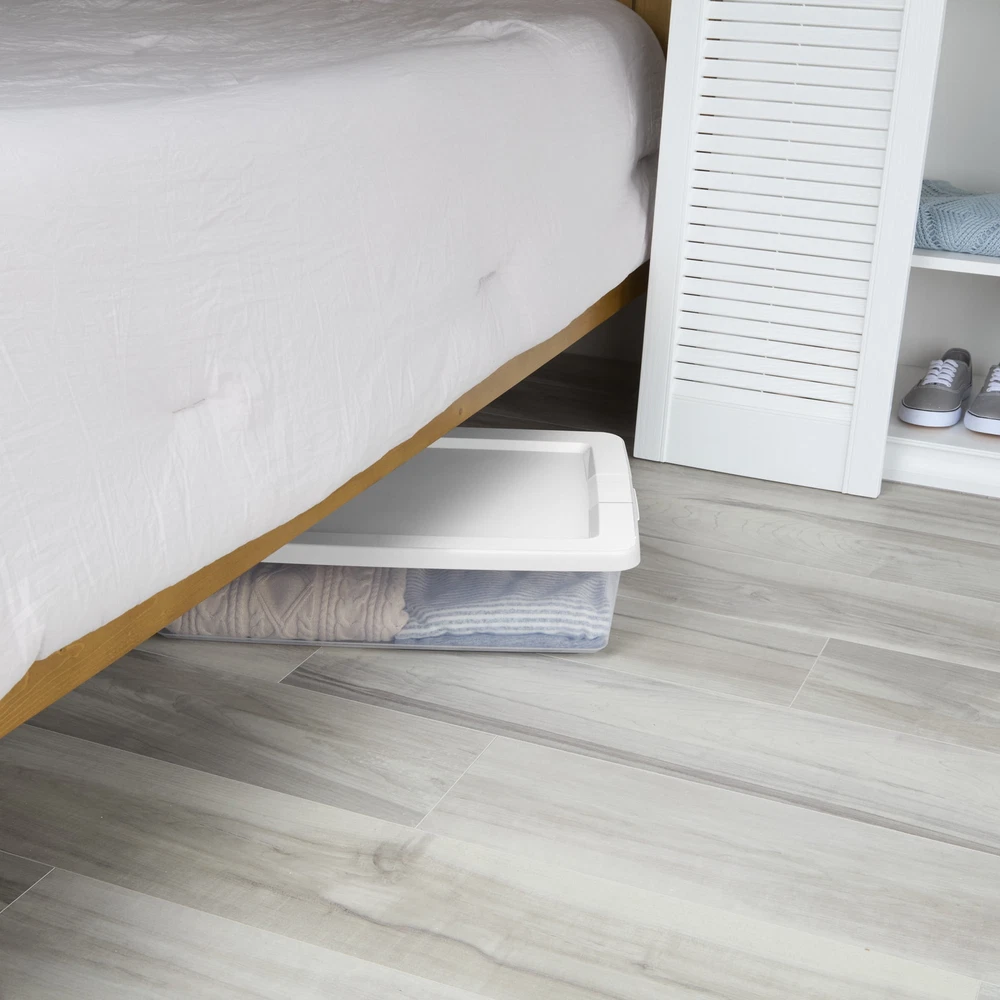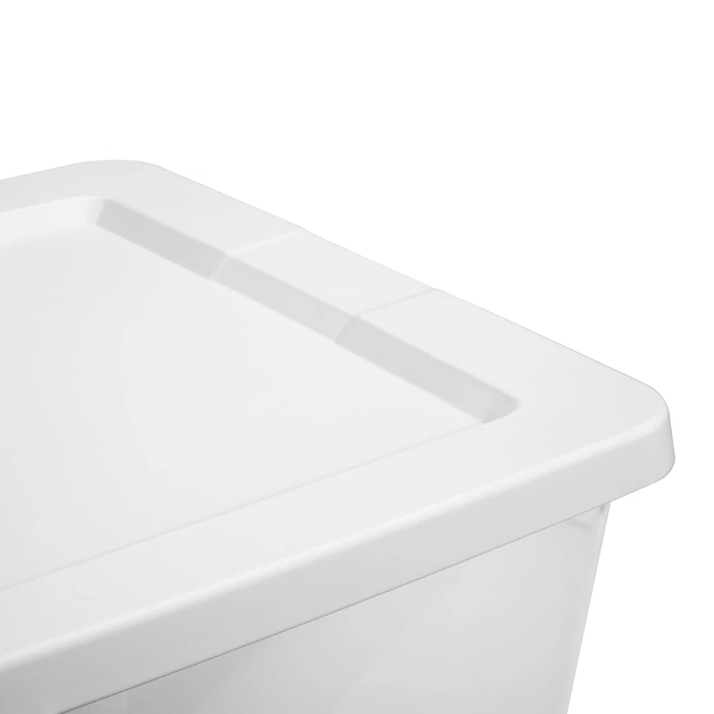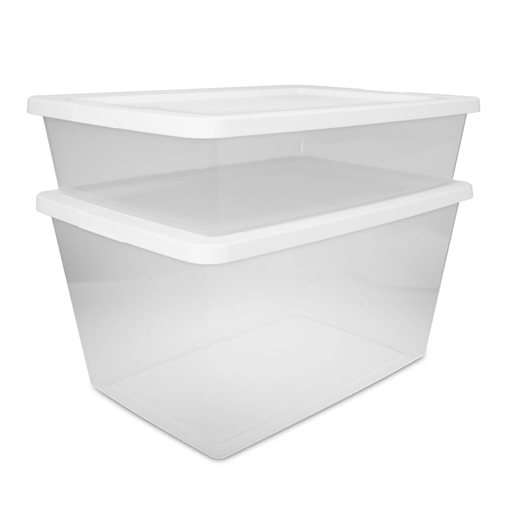 Get organized with the modern Sterilite Clear Storage Box line! The Sterilite Set of (2) 28 Quart Storage Boxes is a convenient two pack of the popular 28 Quart size, and is ideal for a variety of basic and lightweight household storage needs. It features a clear base that allows contents to be easily identified and an opaque lid that snaps firmly onto the base to keep contents contained and secure. This storage box is ideal for organizing and storing towels, clothing and linens and fits conveniently underneath the bed for out of sight storage. Recessed lids allow containers of the same size to securely stack on top of each other for efficient use of vertical storage space. When storing items away, use good judgment and don’t overload them or stack them too high; be mindful of the weight in each box and place the heaviest box on the bottom. The overall assembled dimensions of this item are 23" L x 16 5/8" W x 5 7/8" H. Sterilite Set of (2) 28 Quart Storage Boxes, Clear Plastic Storage Bin with Snap-on Lid, White Outside Dimensions: 23" x 16 5/8" x 5 7/8" Interior Dimensions at bottom: 20 3/8" x 14 1/8" x 5 1/8" Opaque lid snaps firmly onto the base and provides a grip for easy lifting Clear base allows contents to easily be viewed and located Recessed lids allow same size storage boxes to securely stack upon each other BPA-free and phthalate-free