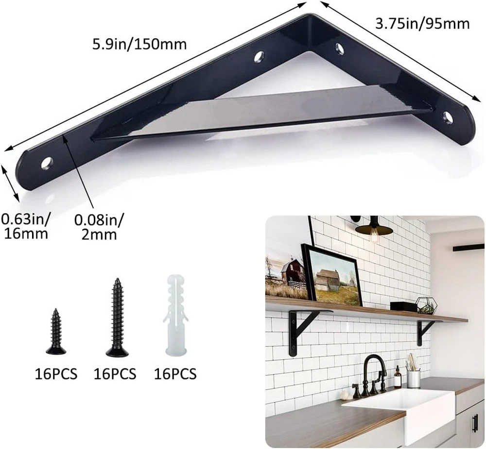Batteries Required?: No Item Width: Does not apply Item Height: Does not apply Size: 6 Inch Type: Does not apply Item dimensions L x W x H: 5.91 x 3.74 x 0.63 inches UPC: 313103828816 Item model number: Shelf Brackets Material: Steel Item Depth: 2 millimeters Finish Type: Glossy Brand: Does not apply Mounting Type: Wall Mount Batteries Included?: No gtin13: 313103828816 Number of Shelves: Does not apply Product Dimensions: 5.91 x 3.74 x 0.63 inches Country of Origin: China Included Components: Bag Item Length: Does not apply Color: Black Item Weight: 1.65 pounds Finish: Glossy