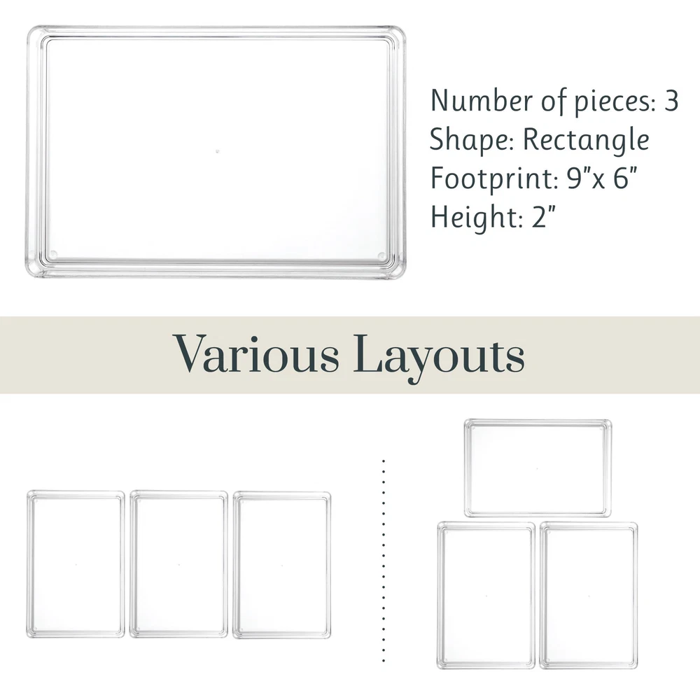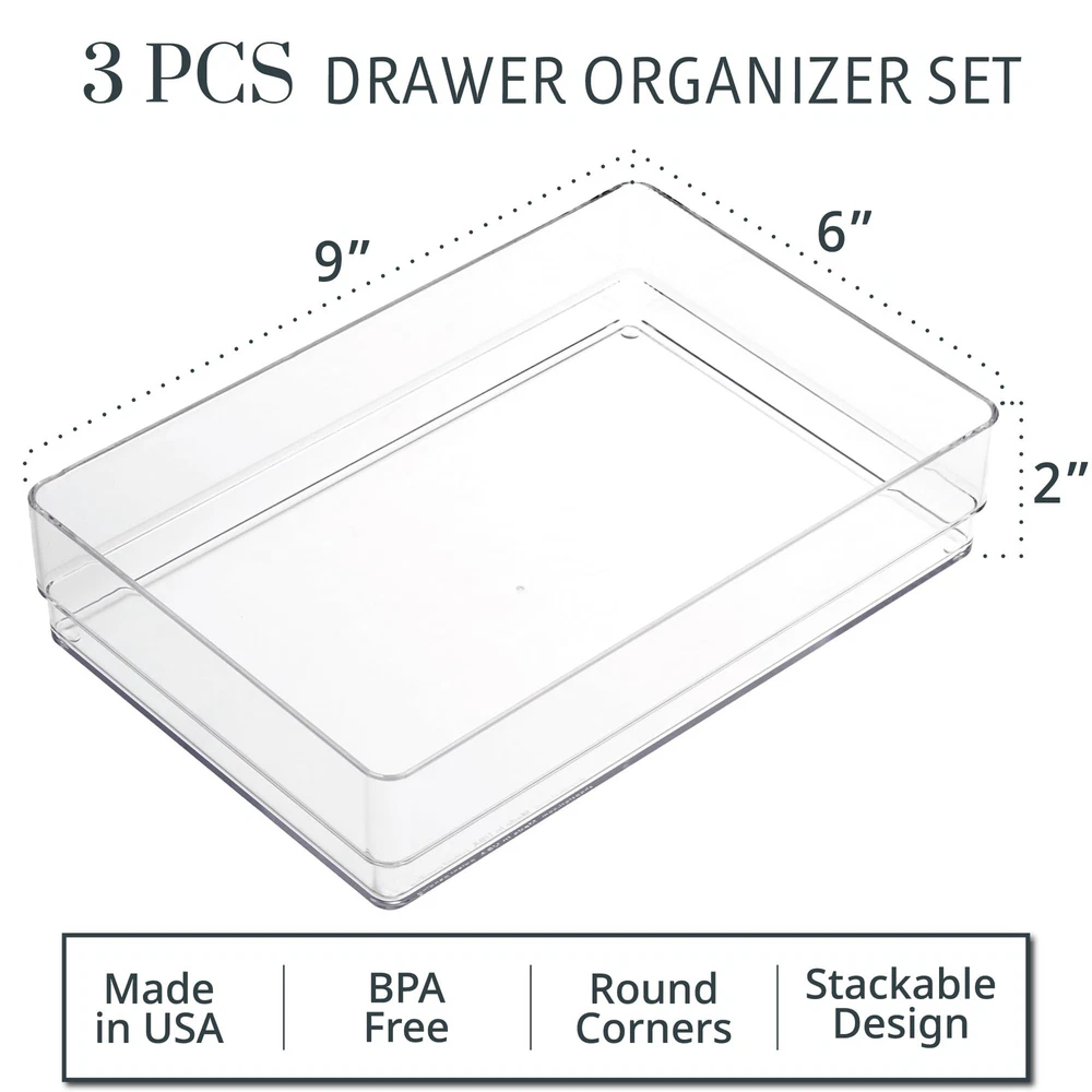 Crafted in the USA from premium, durable BPA-free clear plastic, our drawer organizers prioritize both quality and environmental responsibility. By choosing domestically made products, you're reducing carbon emissions from production to delivery compared to products produced overseas. Experience unparalleled versatility with our stackable design, perfectly suited for a myriad of items including cosmetics, jewelry, kitchen utensils, and office supplies. Say goodbye to cluttered spaces and hello to streamlined organization as these trays effortlessly maximize every inch of available space, transforming even the most chaotic drawers into orderly spaces. Take control of your storage solutions with ease by customizing your layout to suit your unique needs. Whether it's in the bathroom, dresser, vanity, or desk, our organizers seamlessly adapt to any environment, providing tailored organization wherever you need it most. Our drawer organizers not only help them keep their new home tidy and clutter-free but also add a touch of elegance to any space. It's the gift that keeps on giving, day after day. Give as a housewarming present for a new home or add to a wedding registry. This comprehensive set includes three meticulously crafted 9-inch by 6-inch shallow drawer organizers, designed to accommodate your essentials with precision. And with additional sizes available, you have the freedom to expand your organizational arsenal to tackle any cluttered drawer with finesse.